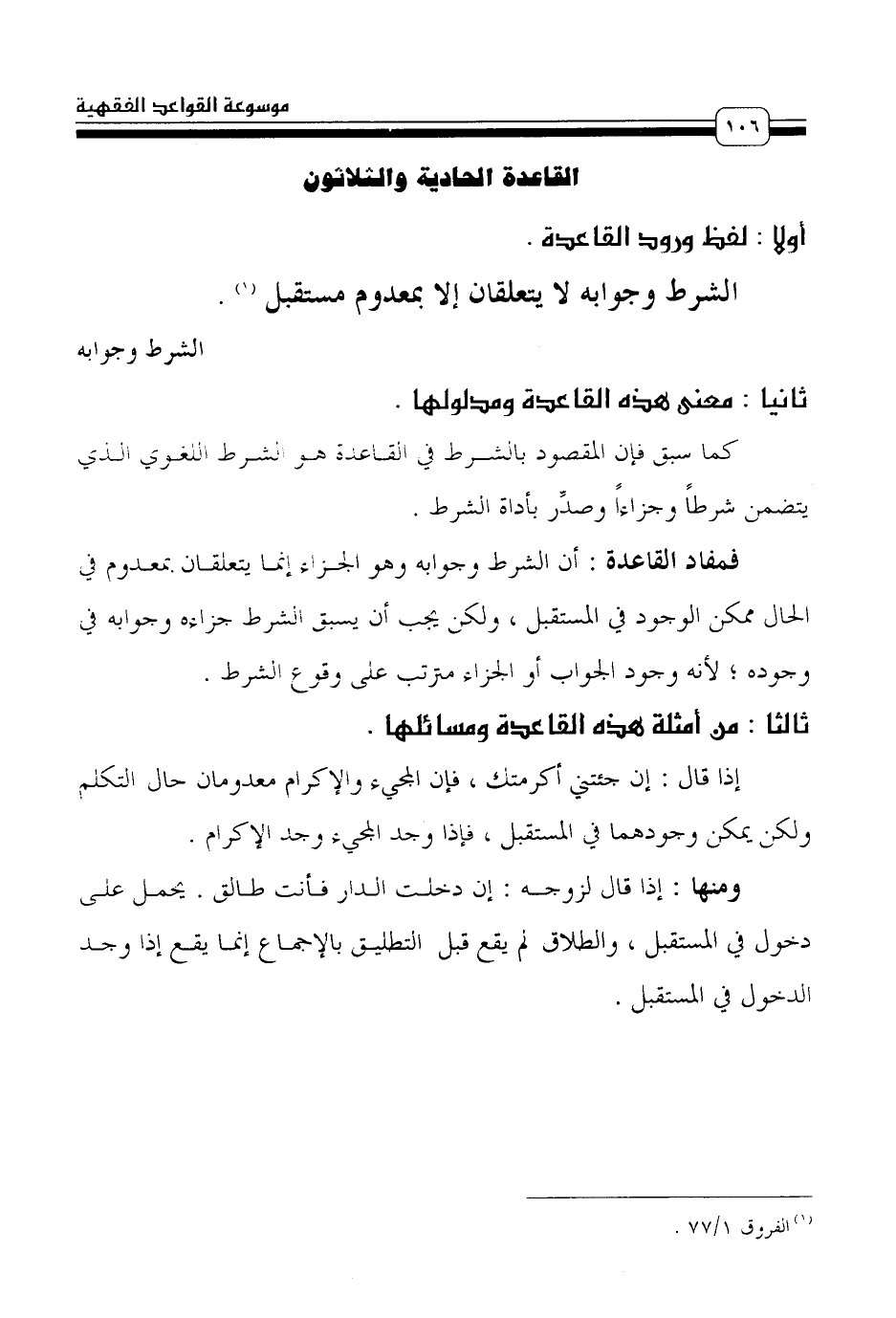 فمفاد القاعدة: أن الشرط وجوابه وهو الجزاء إنما يتعلقان. بمعدوم في الحال ممكن الوجود في المستقبل، ولكن يجب أن يسبق الشرط جزاءه وجوابه في وجوده؛ لأنَّه وجود الجواب أو الجزاء مترتب على وقوع الشرط.