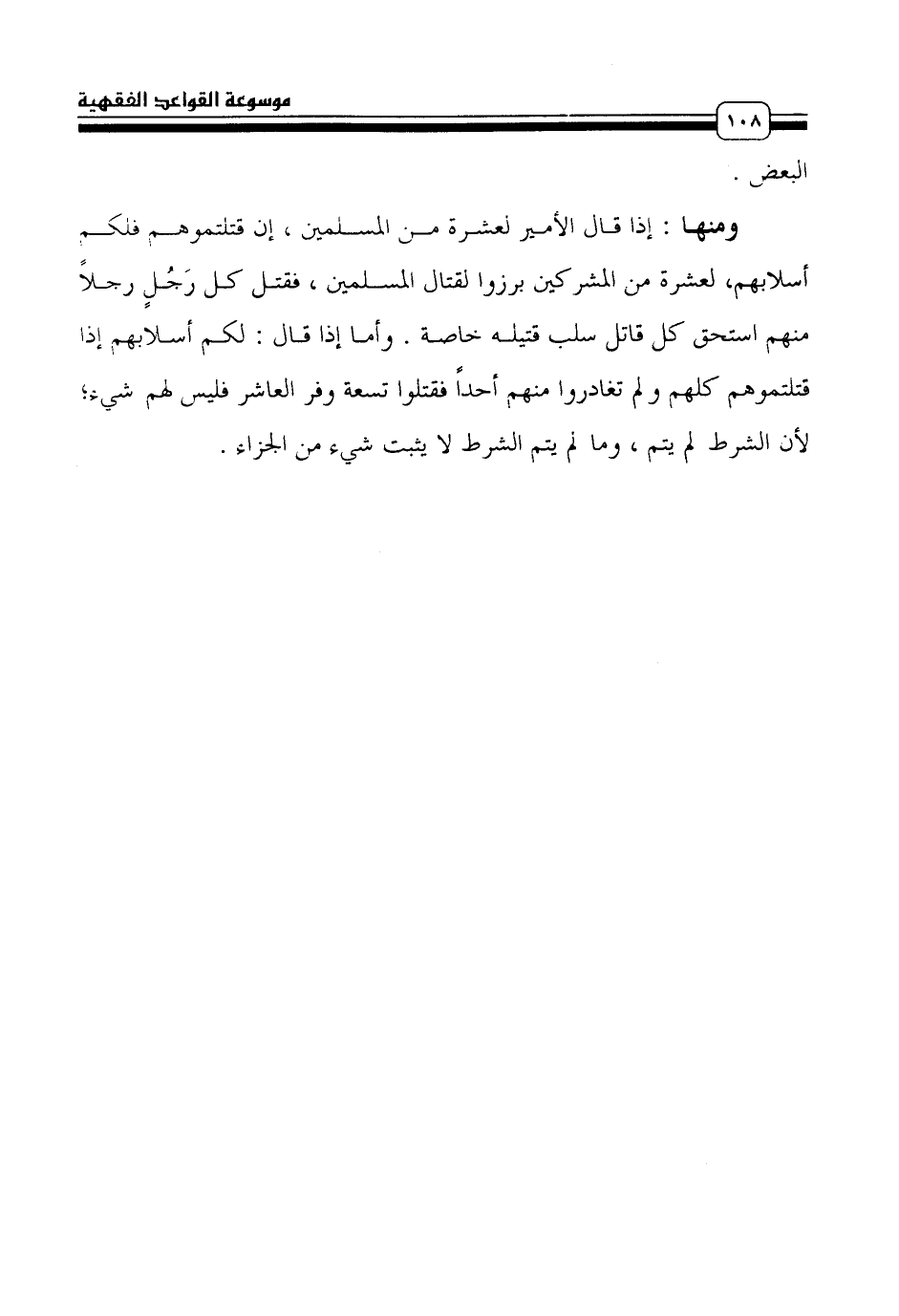 ومنها: إذا قال الأمير لعشرة من المسلمين، إن قتلتموهم فلكم أسلابهم، لعشرة من المشركين برزوا لقتال المسلمين، فقتل كل رَجُلٍ رجلاً منهم استحق كل قاتل سلب قتيله خاصة. وأما إذا قال: لكم أسلابهم إذا قتلتموهم كلهم ولم تغادروا منهم أحداً فقتلوا تسعة وفر العاشر فليس لهم شيء؛ لأن الشرط لم يتم، وما لم يتم الشرط لا يثبت شيء من الجزاء.