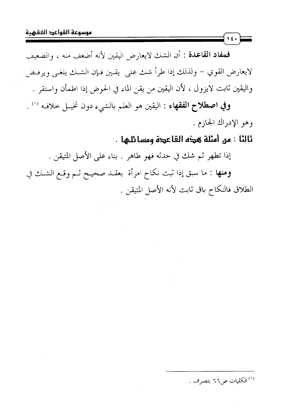 فمفاد القاعدة: أن الشك لا يعارض اليقين لأنه أضعف منه، والضعيف لا يعارض القوي - ولذلك إذا طرأ شك على يقين فإن الشك يلغى ويرفض واليقين ثابت لا يزول, لأن اليقين من يقن الماء في الحوض إذا اطمأن واستقر.