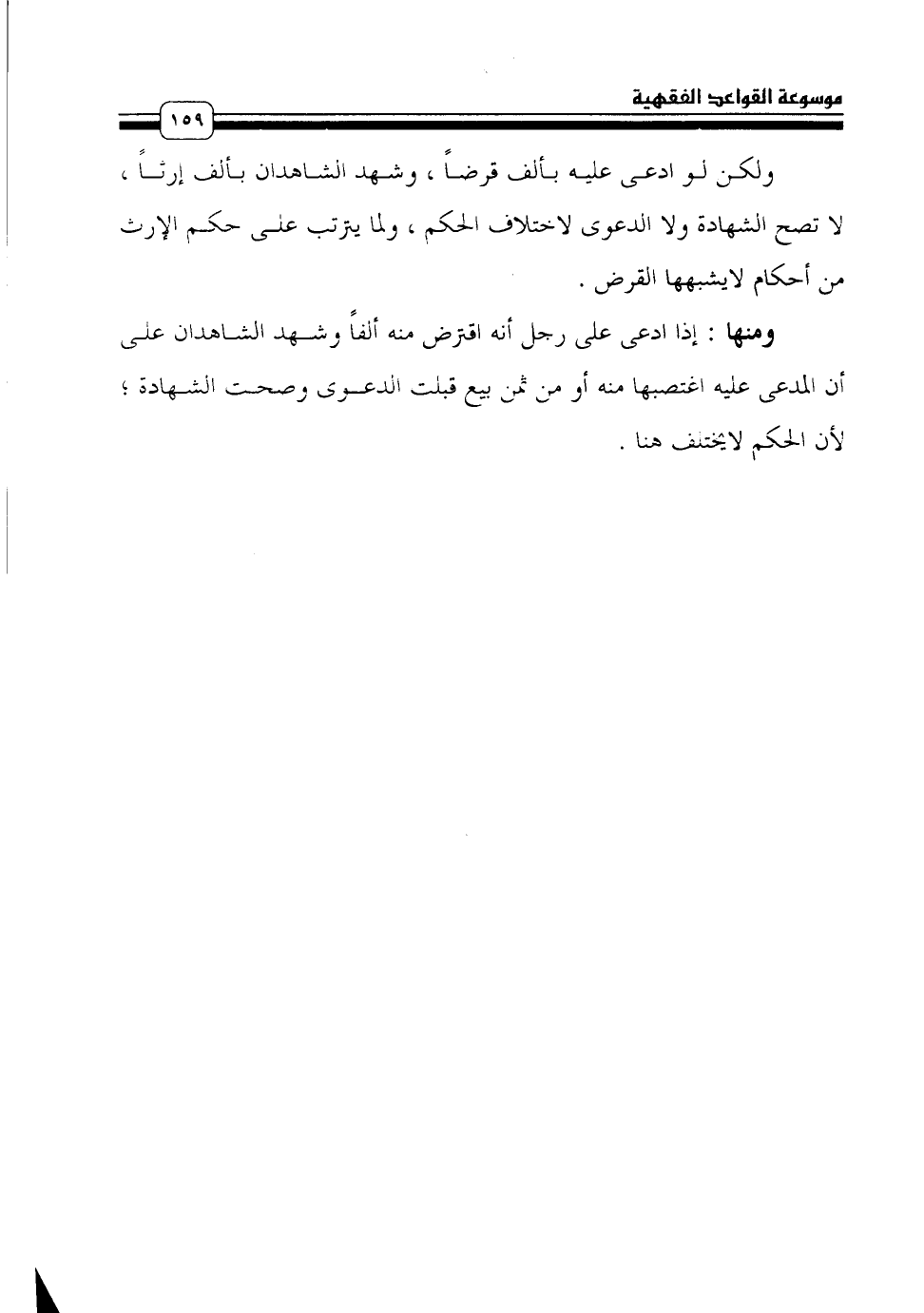 ولكن لو ادعى عليه بألف قرضاً، وشهد الشاهدان بألف إرثاً، لا تصح الشهادة ولا الدعوى لاختلاف الحكم، ولما يترتب على حكم الإرث من أحكام لا يشبهها القرض.