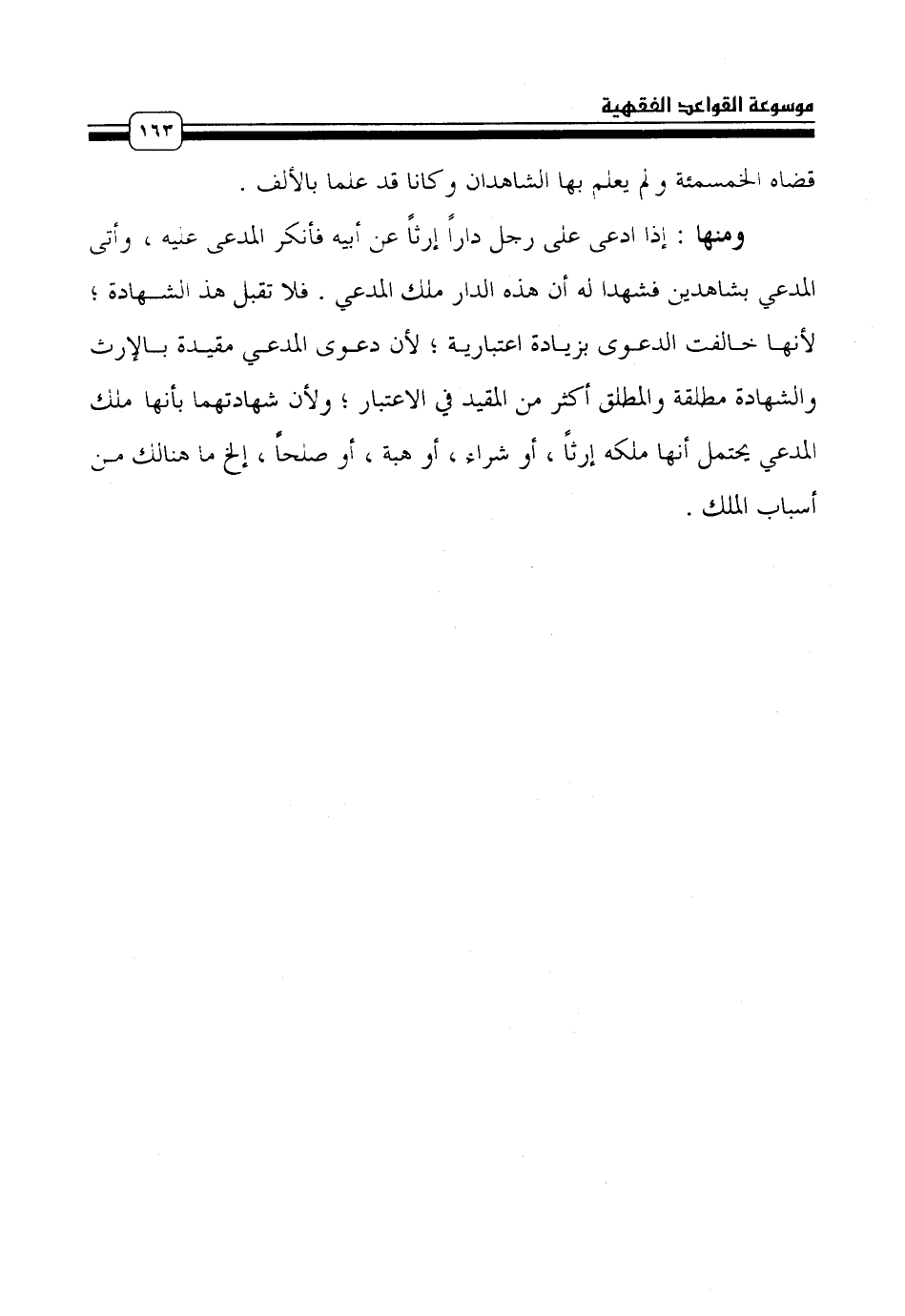 ومنها: إذا ادعى على رجل داراً إرثاً عن أبيه فأنكر المدعى عليه، وأتى المدعي بشاهدين فشهدا له أن هذه الدار ملك المدعي. فلا تقبل هذه الشهادة؛ لأنها خالفت الدعوى بزيادة اعتبارية؛ لأن دعوى المدعي مقيدة بالإرث والشهادة مطلقة والمطلق أكثر من المقيد في الاعتبار؛ ولأن شهادتهما بأنها ملك المدعي يحتمل أنها ملكه إرثاً، أو شراء، أو هبة، أو صلحاً، إلخ ما هنالك من أسباب الملك.
