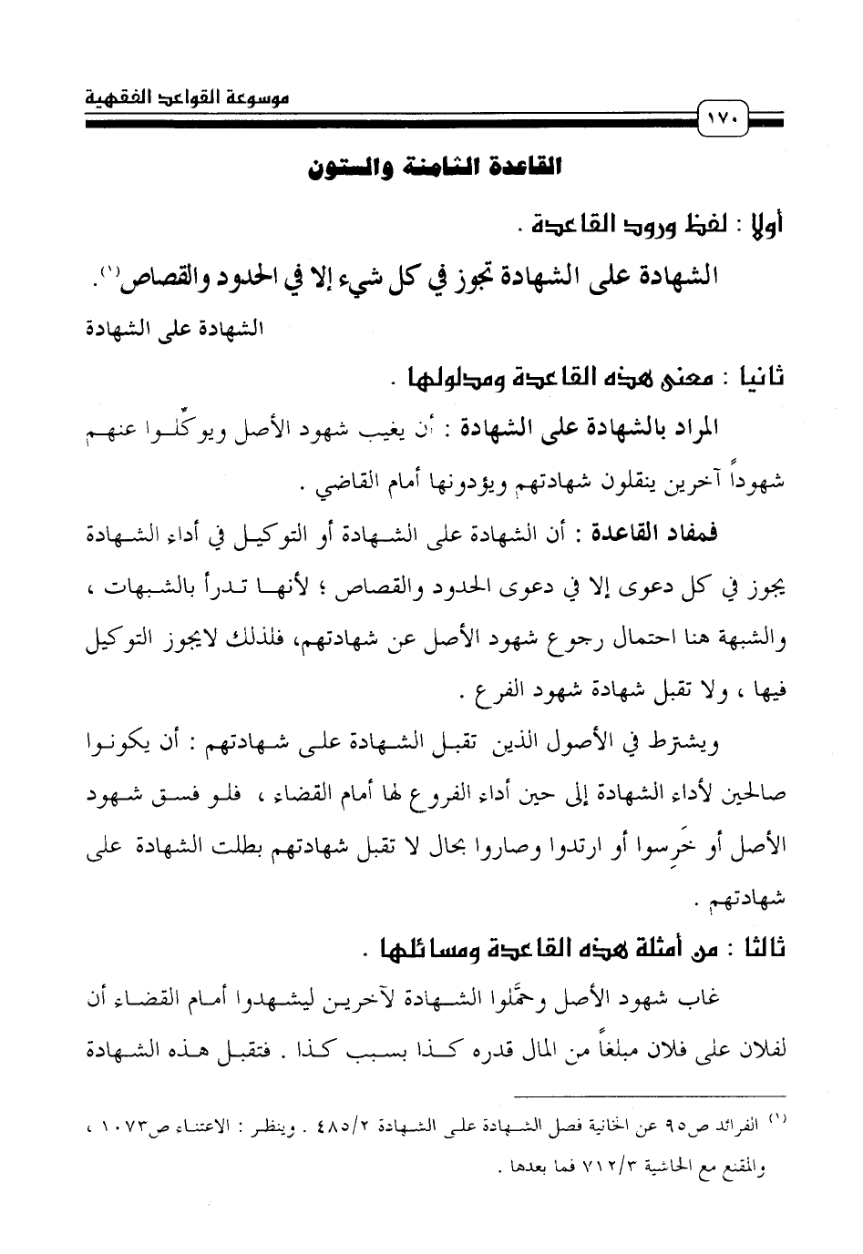 فمفاد القاعدة: أن الشهادة على الشهادة أو التوكيل في أداء الشهادة يجوز في كل دعوى إلا في دعوى الحدود والقصاص؛ لأنها تدرأ بالشبهات، والشبهة هنا احتمال رجوع شهود الأصل عن شهادتهم، فلذلك لا يجوز التوكيل فيها، ولا تقبل شهادة شهود الفرع.