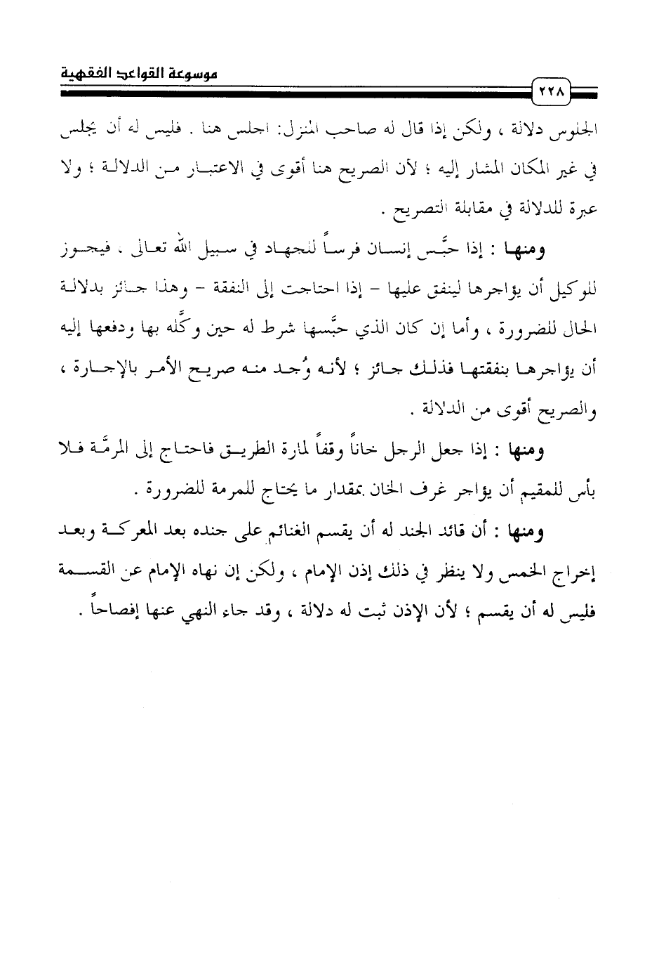 ومنها: إذا حبَّس إنسان فرساً للجهاد في سبيل الله تعالى, فيجوز للوكيل أن يؤاجرها لينفق عليها - إذا احتاجت إلى النفقة - وهذا جائز بدلالة الحال للضرورة، وأما إن كان الذى حبَّسها شرط له حين وكَّله بها ودفعها إليه أن يؤاجرها بنفقتها فذلك جائز؛ لأنه وُجد منه صريح الأمر بالإجارة، والصريح أقوى من الدلالة.