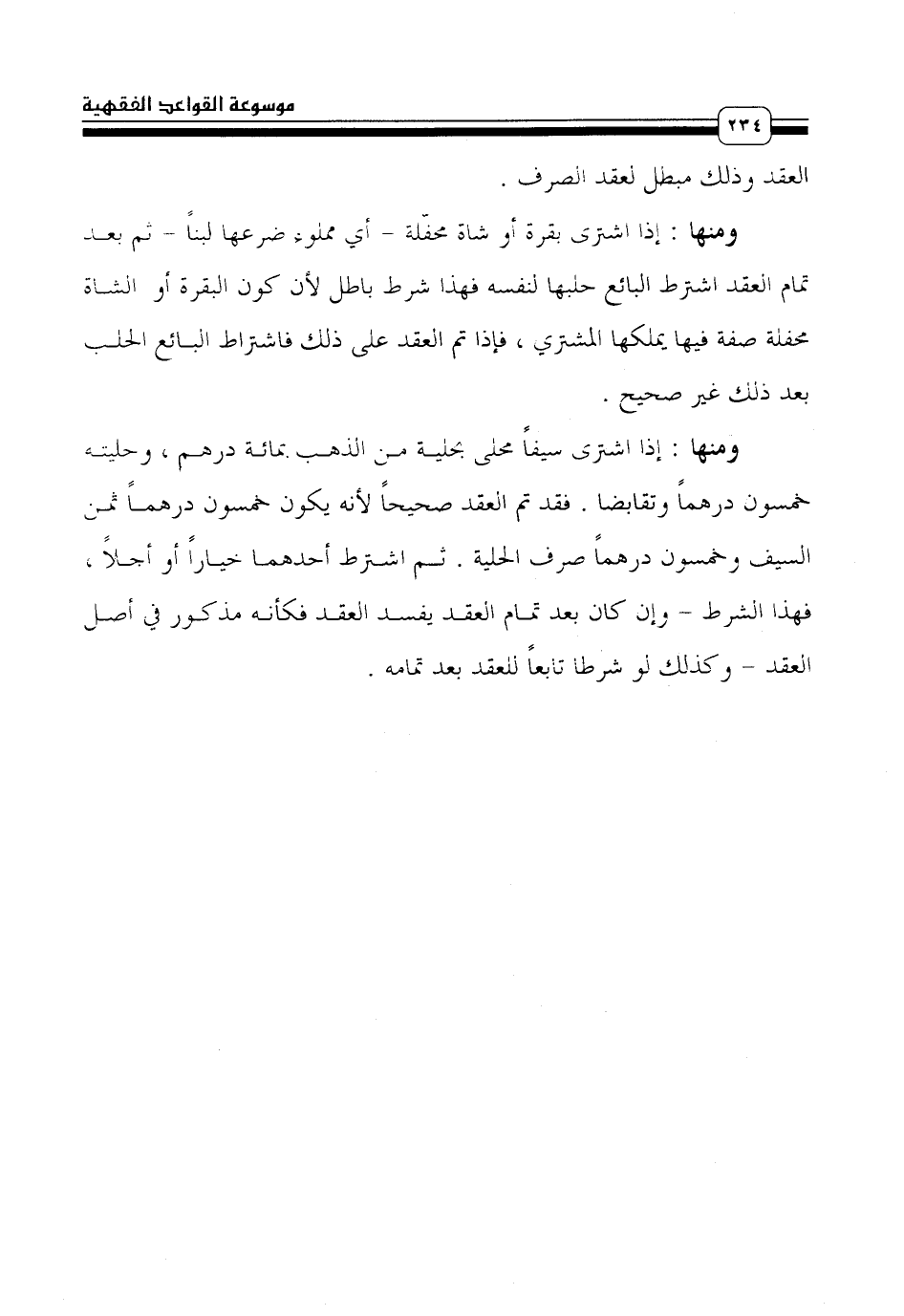 ومنها: إذا اشترى بقرة أو شاة محفّلة - أى مملوء ضرعها لبناً - ثم بعد تمام العقد اشترط البائع حلبها لنفسه فهذا شرط باطل لأن كون البقرة أو الشاة محفلة صفة فيها يملكها المشتري، فإذا تم العقد على ذلك فاشتراط البائع الحلب بعد ذلك غير صحيح.
