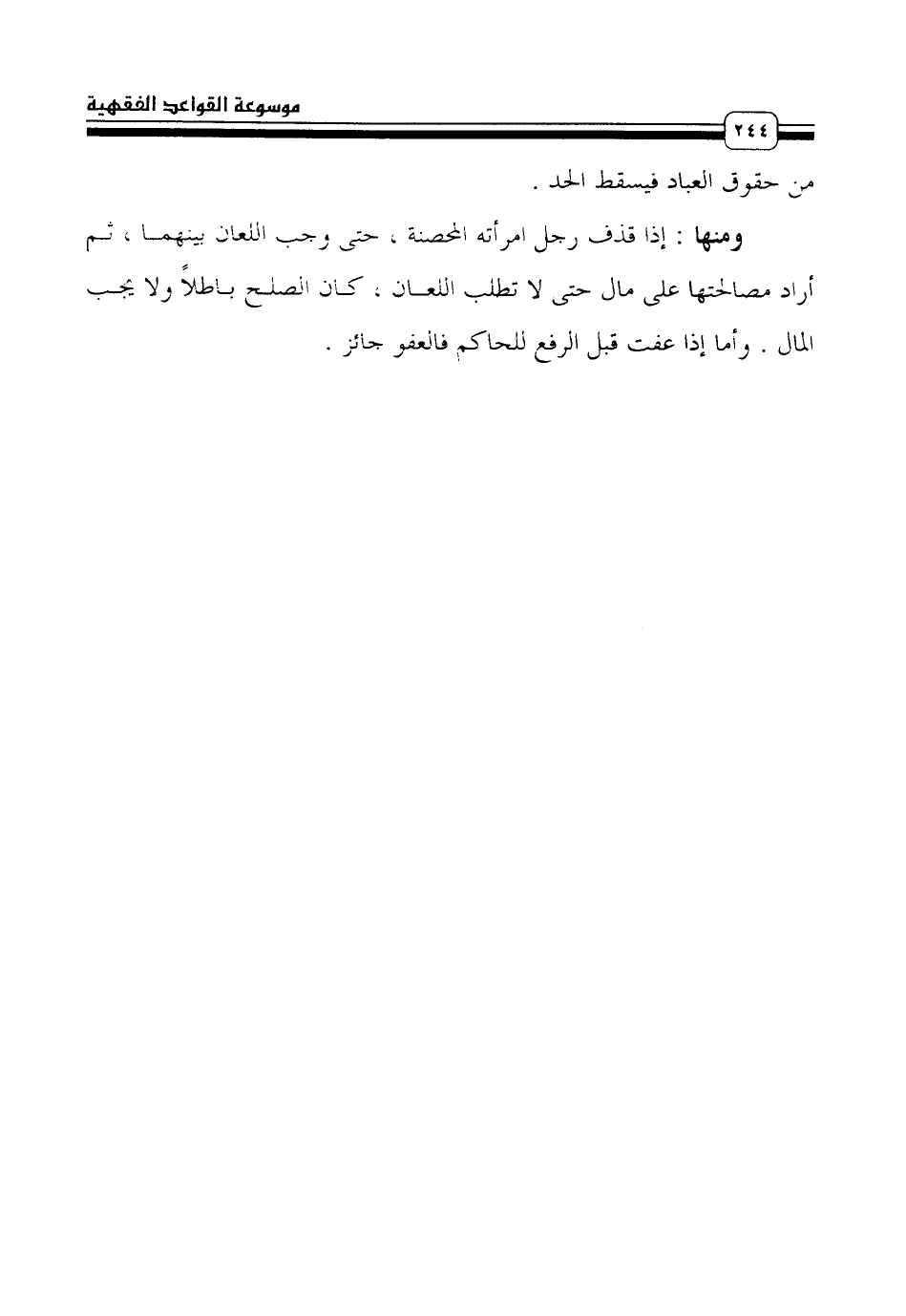 ومنها: إذا قذف رجل امرأته المحصنة، حتى وجب اللعان بينهما، ثم أراد مصالحتها على مال حتى لا تطلب اللعان، كان الصلح باطلاً ولا يجب المال. وأما إذا عفت قبل الرفع للحاكم فالعفو جائز.
