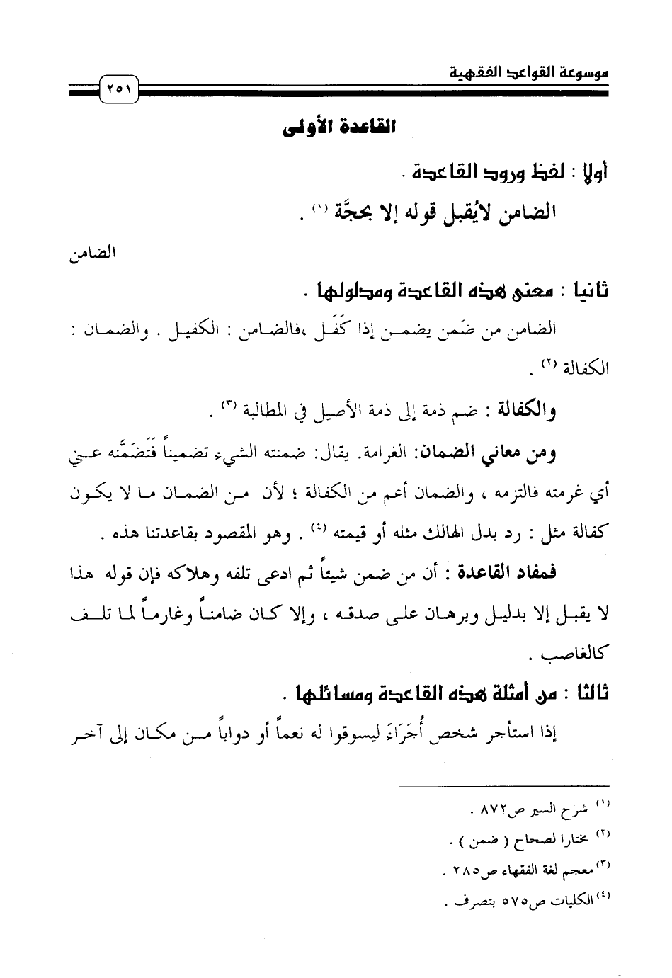 ومن معاني الضمان: الغرامة. يقال: ضمنته الشيء تضميناً فَتَضَمَّنه عني أي غرمته فالتزمه، والضمان أعم من الكفالة؛ لأن من الضمان ما لا يكون كفالة مثل: رد بدل الهالك مثله أو قيمته (¬4). وهو المقصود بقاعدتنا هذه.