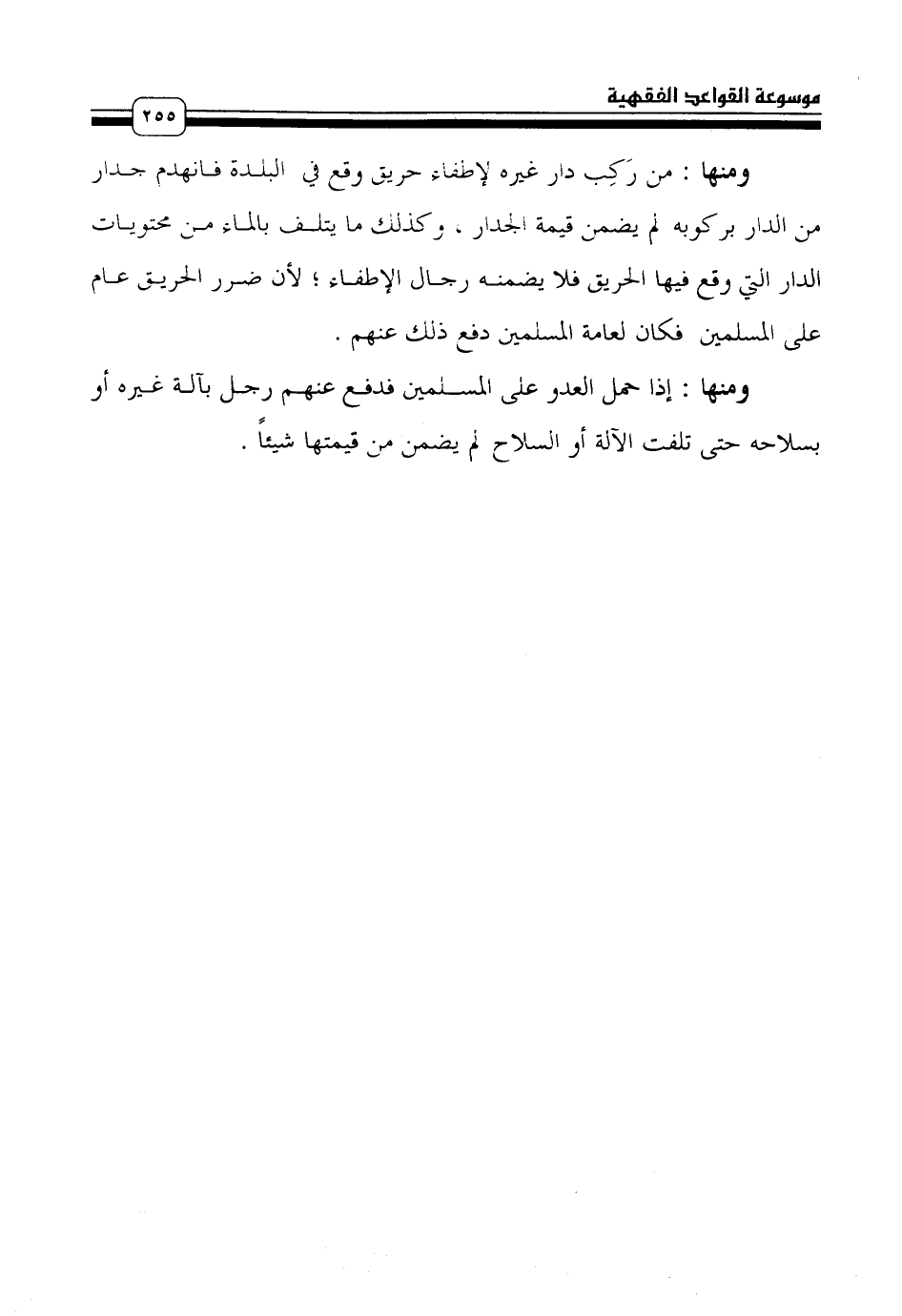 ومنها: من رَكِب دار غيره لإطفاء حريق وقع في البلدة فانهدم جدار من الدار بركوبه لم يضمن قيمة الجدار، وكذلك ما يتلف بالماء من محتويات الدار التي وقع فيها الحريق فلا يضمنه رجال الإطفاء؛ لأن ضرر الحريق عام على المسلمين فكان لعامة المسلمين دفع ذلك عنهم.