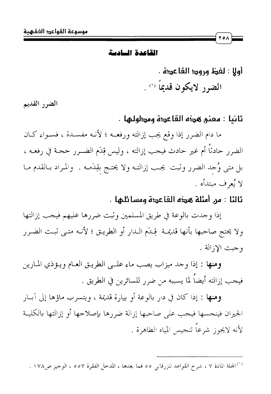 ما دام الضرر إذا وقع يجب إزالته ورفعه؛ لأنه مفسدة، فسواء كان الضرر حادثاً أم غير حادث فيجب إزالته، وليس قِدَم الضرر حجة في رفعه، بل متى وُجِد الضرر وثبت يجب إزالته ولا يحتج بِقِدَمه. والمراد بالقدم ما لا يُعرف مبتدأه.