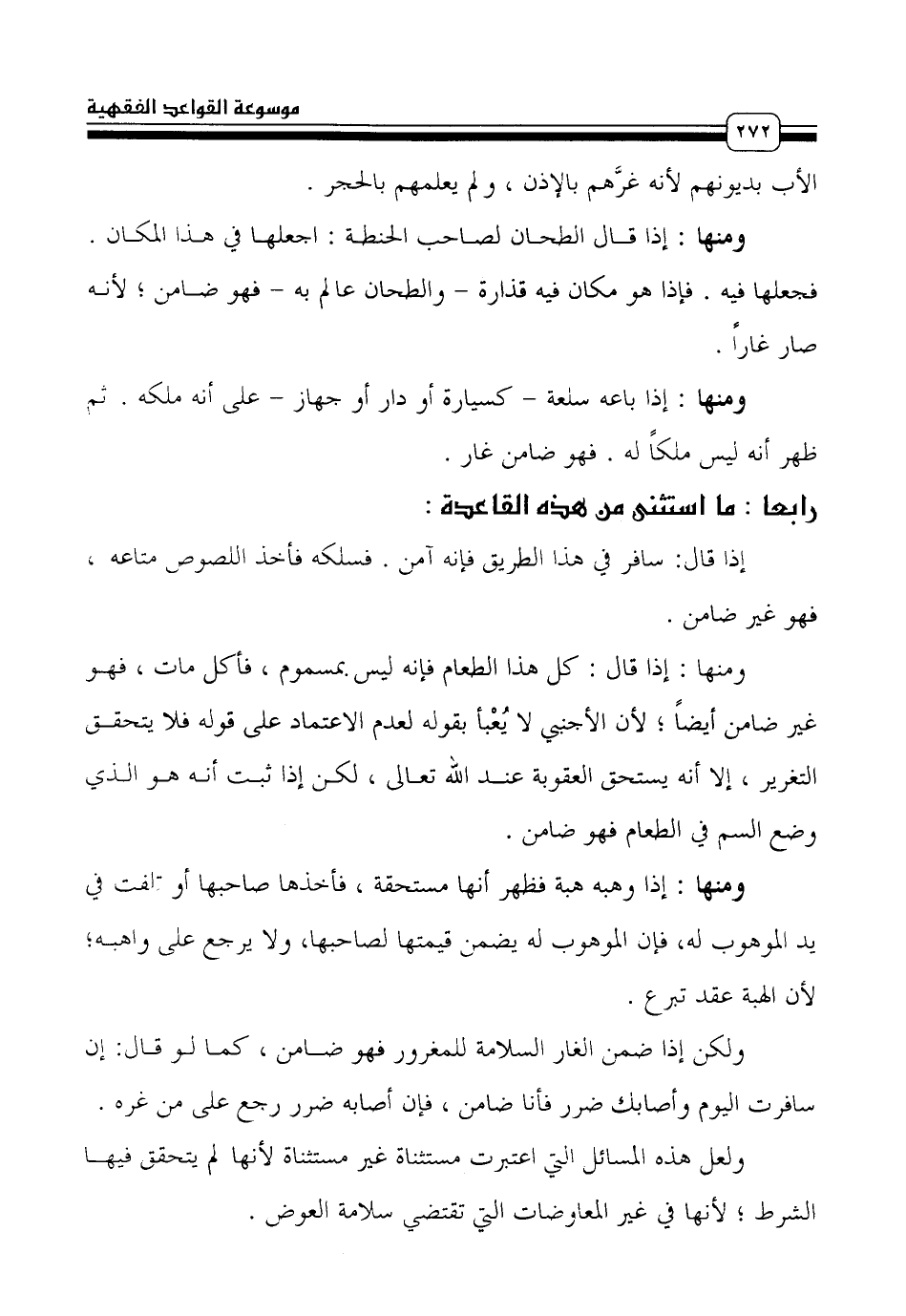 ومنها: إذا قال: كل هذا الطعام فإنه ليس بمسموم، فأكل مات، فهو غير ضامن أيضاً؛ لأن الأجنبي لا يُعْبأ بقوله لعدم الاعتماد على قوله فلا يتحقق التغرير، إلا أنه يستحق العقوبة عند الله تعالى، لكن إذا ثبت أنه هو الذي وضع السم في الطعام فهو ضامن.