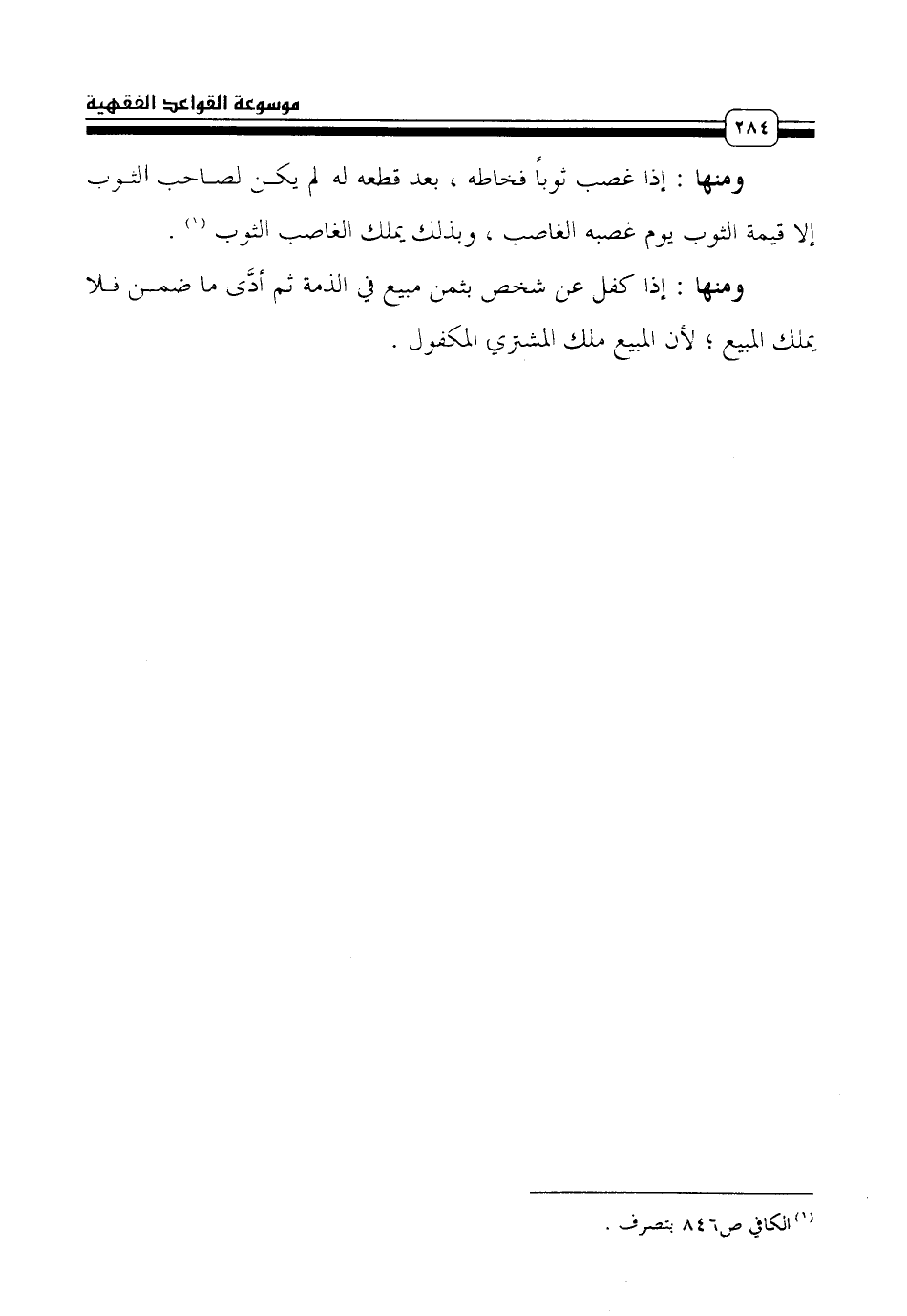 ومنها: إذا غصب ثوباً فخاطه، بعد قطعه له لم يكن لصاحب الثوب إلا قيمة الثوب يوم غصبه الغاصب، وبذلك يملك الغاصب الثوب (¬1).
