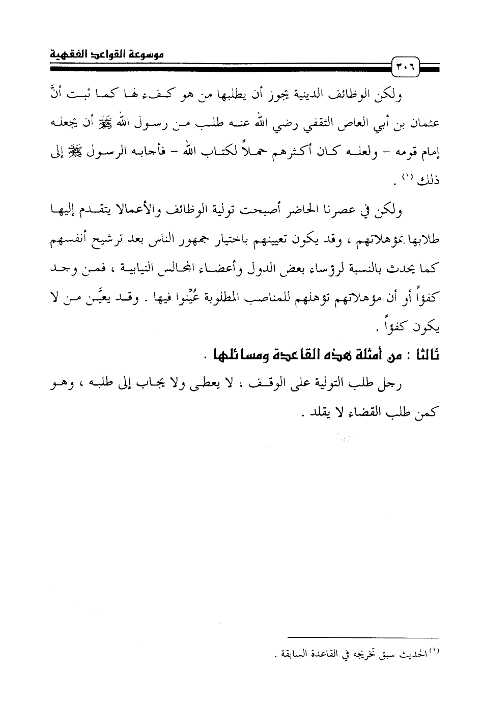 ولكن الوظائف الدينية يجوز أن يطلبها من هو كفء كما ثبت أنَّ عثمان بن أبي العاص الثقفي رضي الله عنه طلب من رسول الله - صلى الله عليه وسلم - أن يجعله إمام قومه - ولعله كان أكثرهم حملاً لكتاب الله - فأجابه الرسول - صلى الله عليه وسلم - إلى ذلك (¬1).