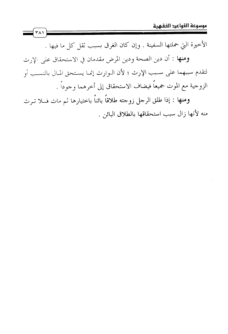 ومنها: إذا طلق الرجل زوجته طلاقاً بائناً باختيارها ثم مات فلا ترث منه لأنها زال سبب استحقاقها بالطلاق البائن.