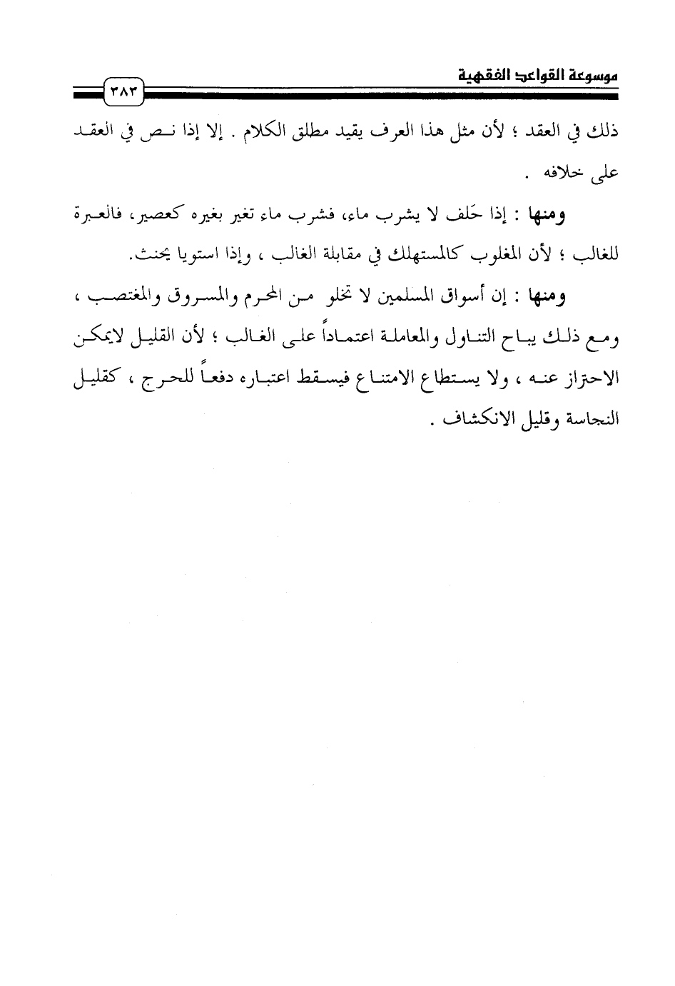 ومنها: إن أسواق المسلمين لا تخلو من المحرم والمسروق والمغتصب، ومع ذلك يباح التناول والمعاملة اعتماداً على الغالب؛ لأن القليل لا يمكن الاحتراز عنه، ولا يستطاع الامتناع فيسقط اعتباره دفعاً للحرج، كقليل النجاسة وقليل الانكشاف.
