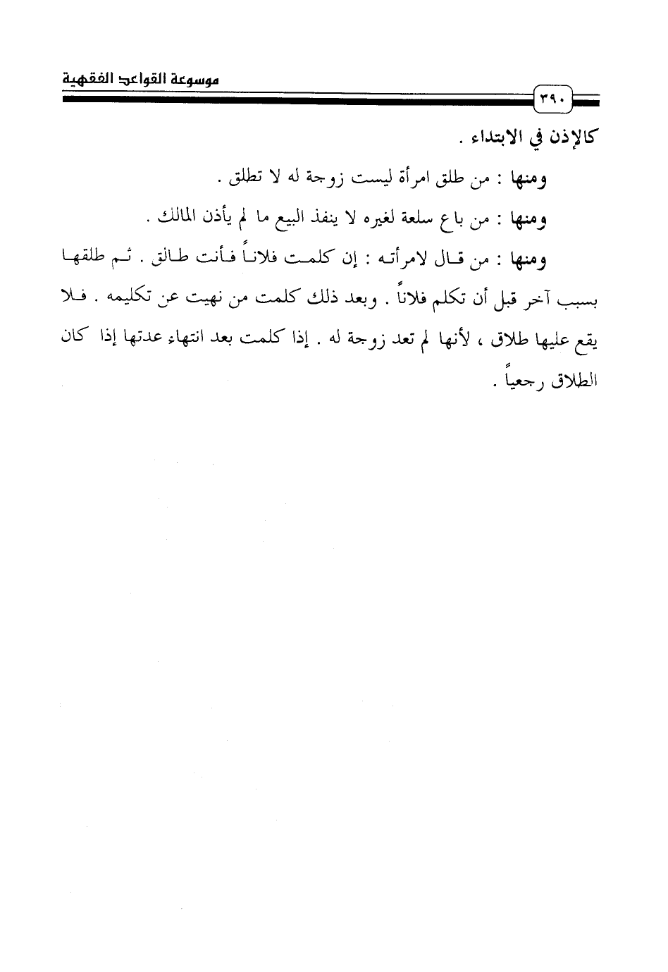 ومنها: من قال لامرأته: إن كلمت فلاناً فأنت طالق. تم طلقها بسبب آخر قبل أن تكلم فلاناً. وبعد ذلك كلمت من نهيت عن تكليمه. فلا يقع عليها طلاق، لأنها لم تعد زوجة له. إذا كلمت بعد انتهاء عدتها إذا كان الطلاق رجعياً.