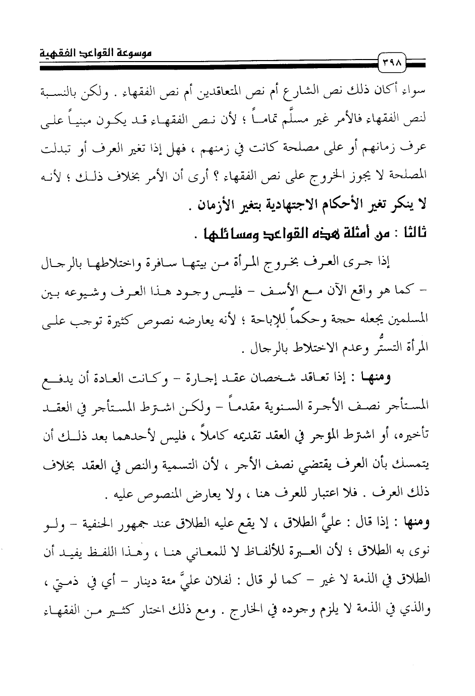 سواء أكان ذلك نص الشارع أم نص المتعاقدين أم نص الفقهاء. ولكن بالنسبة لنص الفقهاء فالأمر غير مسلَّم تماماً؛ لأن نص الفقهاء قد يكون مبنياً على عرف زمانهم أو على مصلحة كانت في زمنهم، فهل إذا تغير العرف أو تبدلت المصلحة لا يجوز الخروج على نص الفقهاء؟ أرى أن الأمر بخلاف ذلك؛ لأنه لا ينكر تغير الأحكام الاجتهادية بتغير الأزمان.