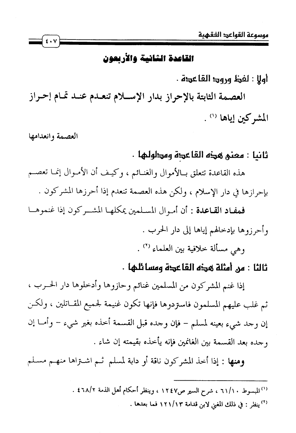 هذه القاعدة تتعلق بالأموال والغنائم، وكيف أن الأموال إنما تعصم بإحرازها في دار الإِسلام، ولكن هذه العصمة تنعدم إذا أحرزها المشركون.