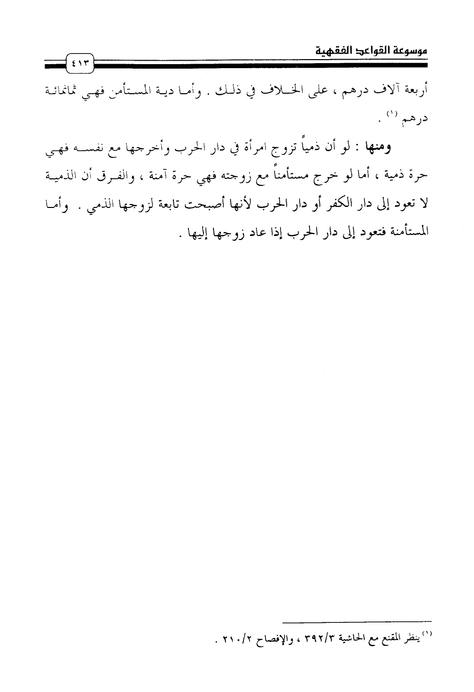 ومنها: لو أن ذمياً تزوج امرأة في دار الحرب وأخرجها مع نفسه فهي حرة ذمية، أما لو خرج مستأمناً مع زوجته فهي حرة آمنة، والفرق أن الذمية لا تعود إلى دار الكفر أو دار الحرب لأنها أصبحت متابعة لزوجها الذمي. وأما المستأمنة فتعود إلى دار الحرب إذا عاد زوجها إليها.