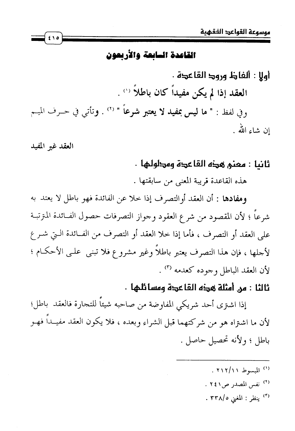 ومفادها: أن العقد أو التصرف إذا خلا عن الفائدة فهو باطل لا يعتد به شرعاً؛ لأن المقصود من شرع العقود وجواز التصرفات حصول الفائدة المترتبة على العقد أو التصرف، فأما إذا خلا العقد أو التصرف عن الفائدة التي شرع لأجلها، فإن هذا التصرف يعتبر باطلاً وغير مشروع فلا تبنى على الأحكام؛ لأن العقد الباطل وجوده كعدمه (¬3).