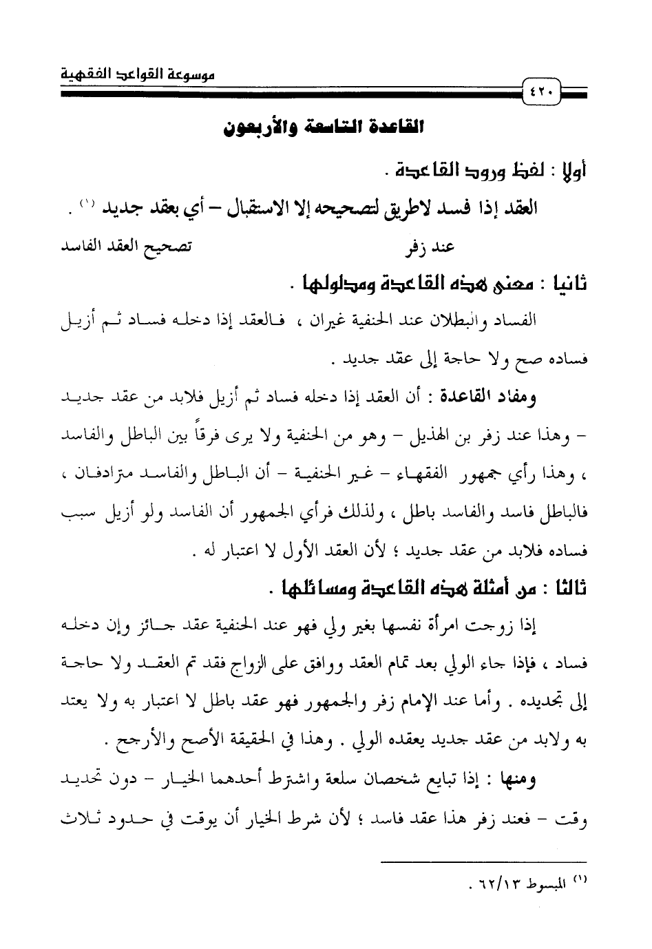 ومفاد القاعدة: أن العقد إذا دخله فساد ثم أزيل فلا بد من عقد جديد - وهذا عند زفر بن الهذيل - وهو من الحنفية ولا يرى فرقاً بين الباطل والفاسد، وهذا رأي جمهور الفقهاء - غير الحنفية - أن الباطل والفاسد مترادفان، فالباطل فاسد والفاسد باطل، ولذلك فرأي الجمهور أن الفاسد ولو أزيل سبب فساده فلا بد من عقد جديد؛ لأن العقد الأول لا اعتبار له.