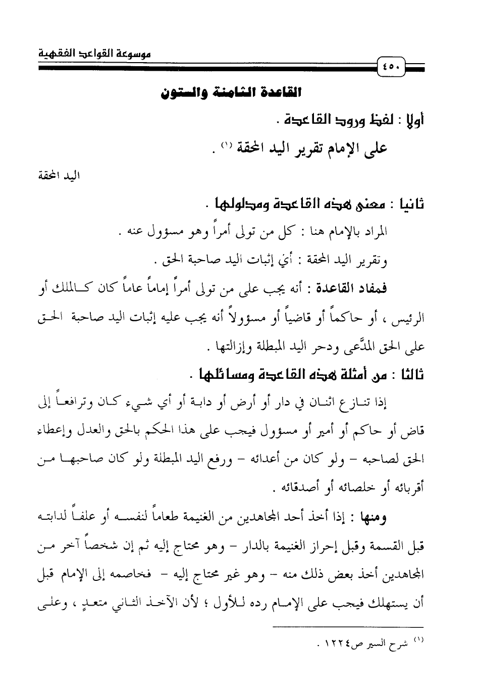 فمفاد القاعدة: أنه يجب على من تولى أمراً إماماً عاماً كان كالملك أو الرئيس، أو حاكماً أو قاضياً أو مسؤولاً أنه يجب عليه إثبات اليد صاحبة الحق على الحق المدَّعى ودحر اليد المبطلة وإزالتها.