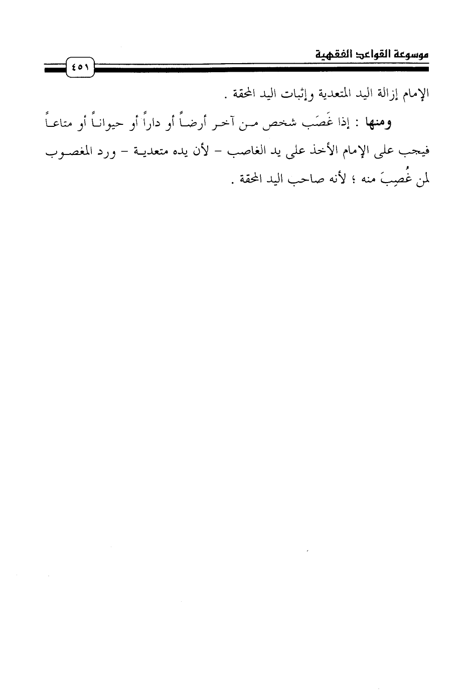 ومنها: إذا غَصَب شخص من آخر أرضاً أو داراً أو حيواناً أو متاعاً فيجب على الإمام الأخذ على يد الغاصب - لأن يده متعدية - ورد المغصوب لمن غُصِبَ منه؛ لأنه صاحب اليد المحقة.