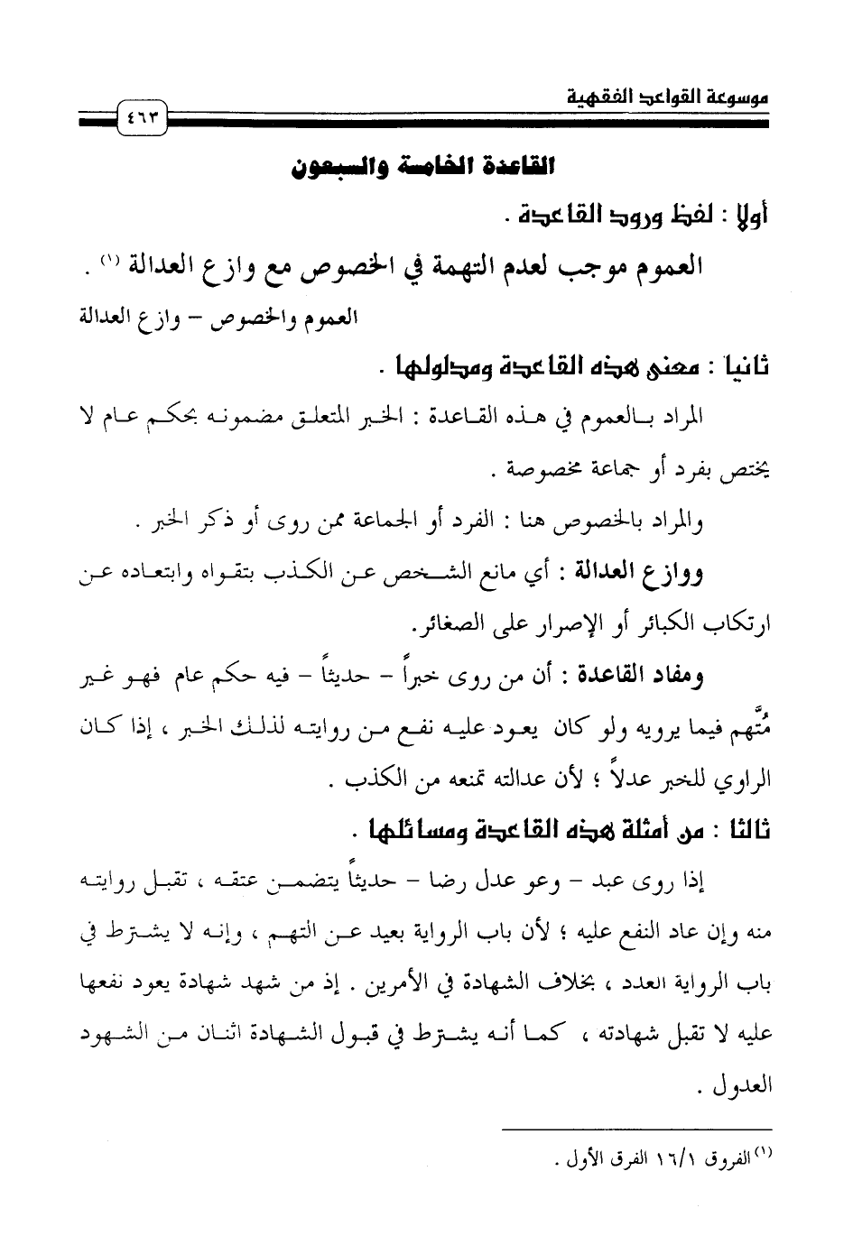 ومفاد القاعدة: أن من روى خبراً - حديثاً - فيه حكم عام فهو غير مُتَّهم فيما يرويه ولو كان يعود عليه نفع من روايته لذلك الخبر، إذا كان الراوي للخبر عدلاً؛ لأن عدالته تمنعه من الكذب.