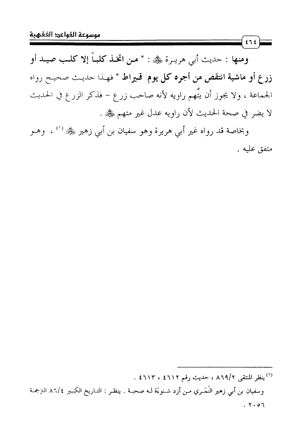 ومنها: حديث أبي هريرة - رضي الله عنه -: "من اتخذ كلباً إلا كلب صيد أو زرع أو ماشية انتقص أجره كل يوم قيراط" فهذا حديث صحيح رواه الجماعة، ولا يجوز أن يتَّهم راويه لأنه صاحب زرع - فذكر الزرع في الحديث لا يضر في صحة الحديث لأن راويه عدل غير متهم - رضي الله عنه -.