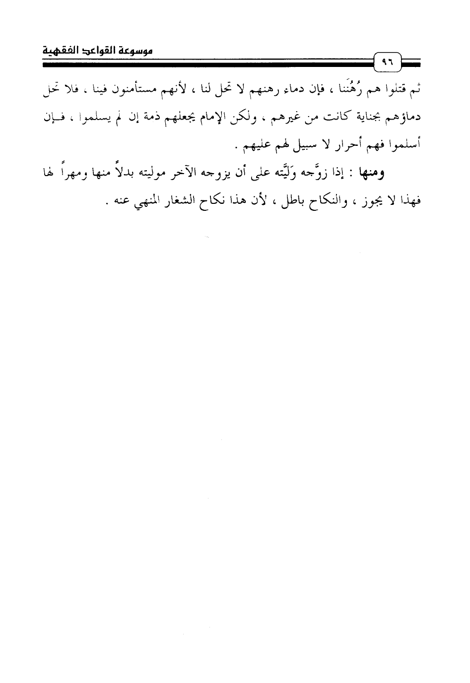 ومنها: إذا زوَّجه وَليَّته علي أن يزوجه الآخر موليته بدلاً منها ومهراً لها فهذا لا يجوز، والنكاح باطل، لأن هذا نكاح الشغار المنهي عنه.