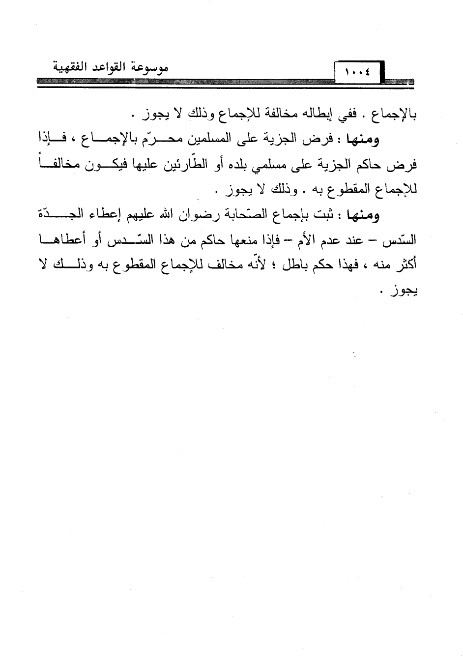 ومنها: فرض الجزية على المسلمين محرّم بالإجماع، فإذا فرض حاكم الجزية على مسلمي بلده أو الطّارئين عليها فيكون مخالفاً للإجماع المقطوع به. وذلك لا يجوز.