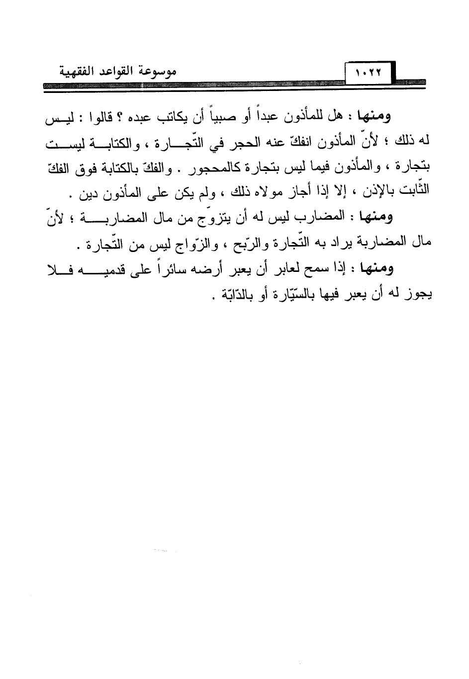 ومنها: هل للمأذون عبداً أو صبياً أن يكاتب عبده؟ قالوا: ليس له ذلك؛ لأنّ المأذون انفكّ عنه الحجر في التّجارة، والكتابة ليست بتجارة، والمأذون فيما ليس بتجارة كالمحجور. والفك بالكتابة فوق الفكّ الثّابت بالإذن، إلا إذا أجاز مولاه ذلك، ولم يكن على المأذون دين.