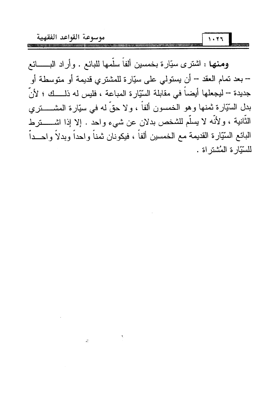 ومنها: اشترى سيّارة بخمسين ألفاً سلّمها للبائع. وأراد البائع - بعد تمام العقد - أن يستولي على سيّارة للمشتري قديمة أو متوسطة أو جديدة - ليجعلها أيضاً في مقابلة السّيّارة المباعة، فليس له ذلك؛ لأنّ بدل السّيّارة ثمنها وهو الخمسون ألفاً، ولا حقّ له في سيّارة المشتري الثّانية، ولأنّه لا يسلّم للشخص بدلان عن شيء واحد. إلا إذا اشترط البائع السّيّارة القديمة مع الخمسين ألفاً، فيكونان ثمناً واحداً وبدلاً واحداً للسّيّارة المُشتراة.