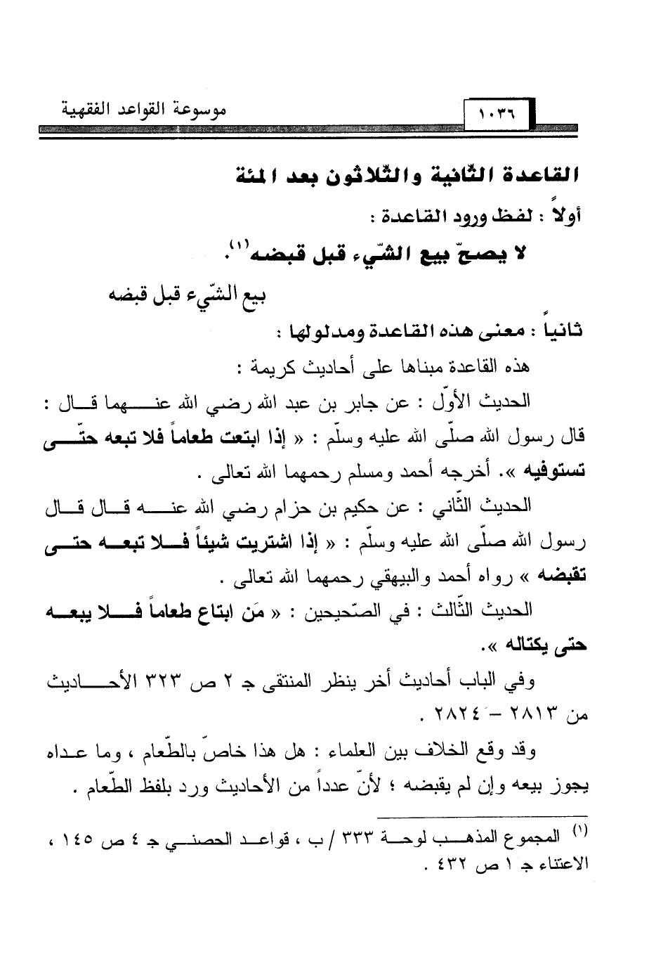 الحديث الأوّل: عن جابر بن عبد الله رضي الله عنهما قال: قال رسول الله صلّى الله عليه وسلّم: "إذا ابتعت طعاما فلا تبعه حتّى تستوفيه". أخرجه أحمد ومسلم رحمهما الله تعالى.