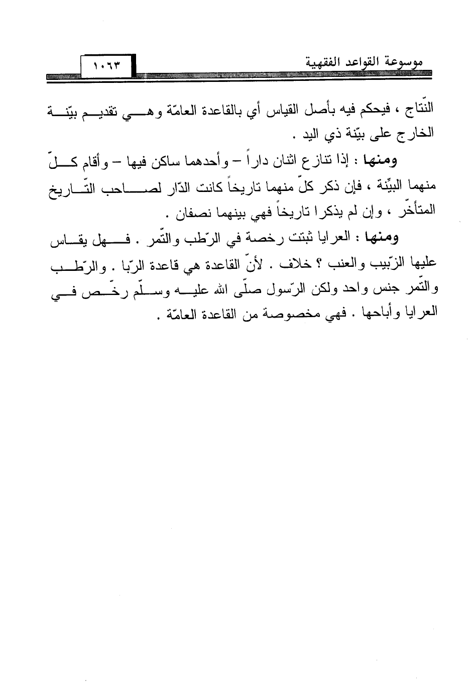 ومنها: العرايا ثبتت رخصة في الرّطب والتّمر. فهل يقاس عليها الزّبيب والعنب؟ خلاف. لأنّ القاعدة هي قاعدة الرّبا. والرّطب والتّمر جنس واحد ولكن الرّسول صلّى الله عليه وسلّم رخّص في العرايا وأباحها. فهي مخصوصة من القاعدة العامّة.