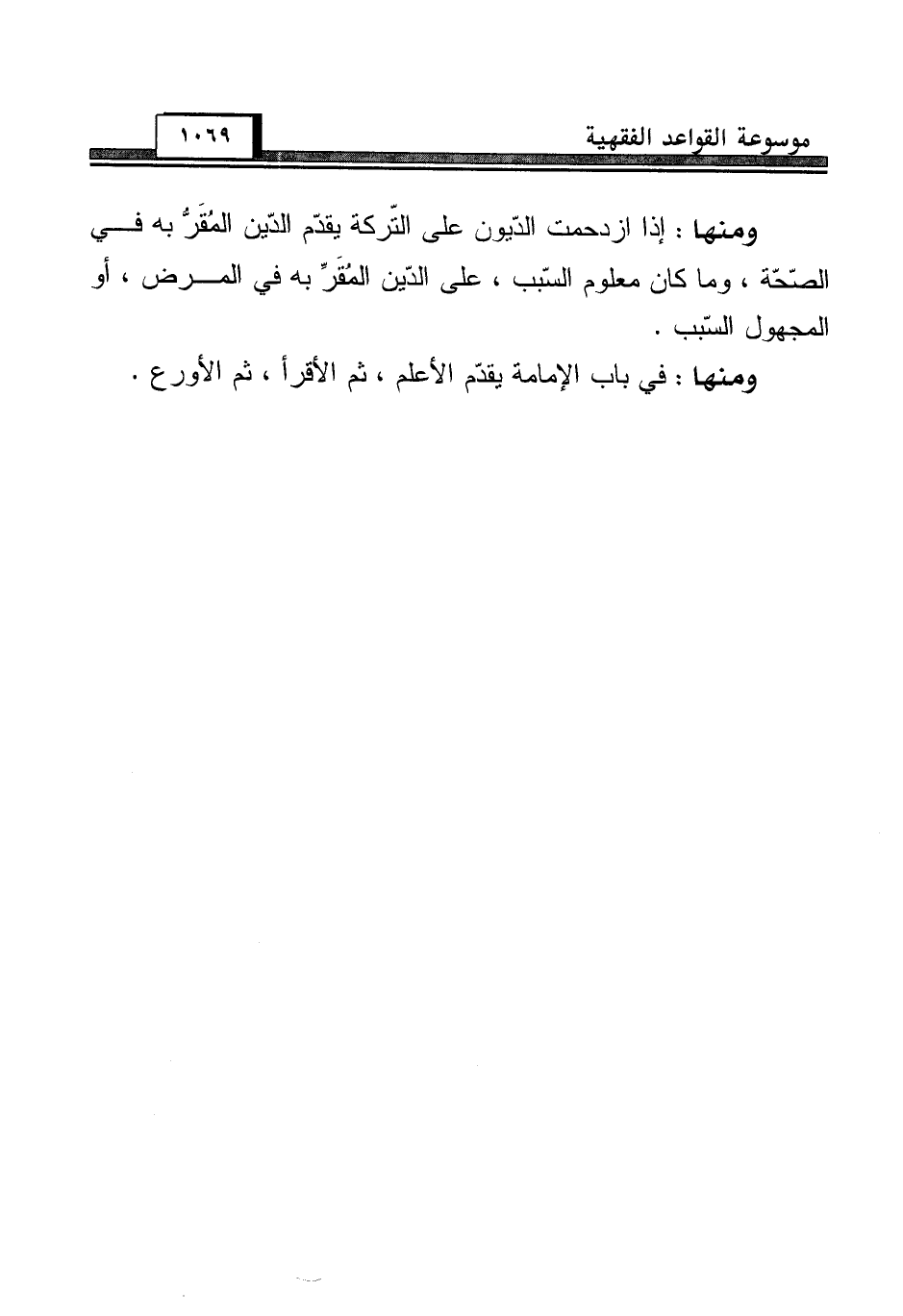 ومنها: إذا ازدحمت الدّيون على التّركة يقدّم الدّين المقَرُّ به في الصّحّة، وما كان معلوم السّبب، على الدّين المُقَرِّ به في المرض، أو المجهول السّبب.