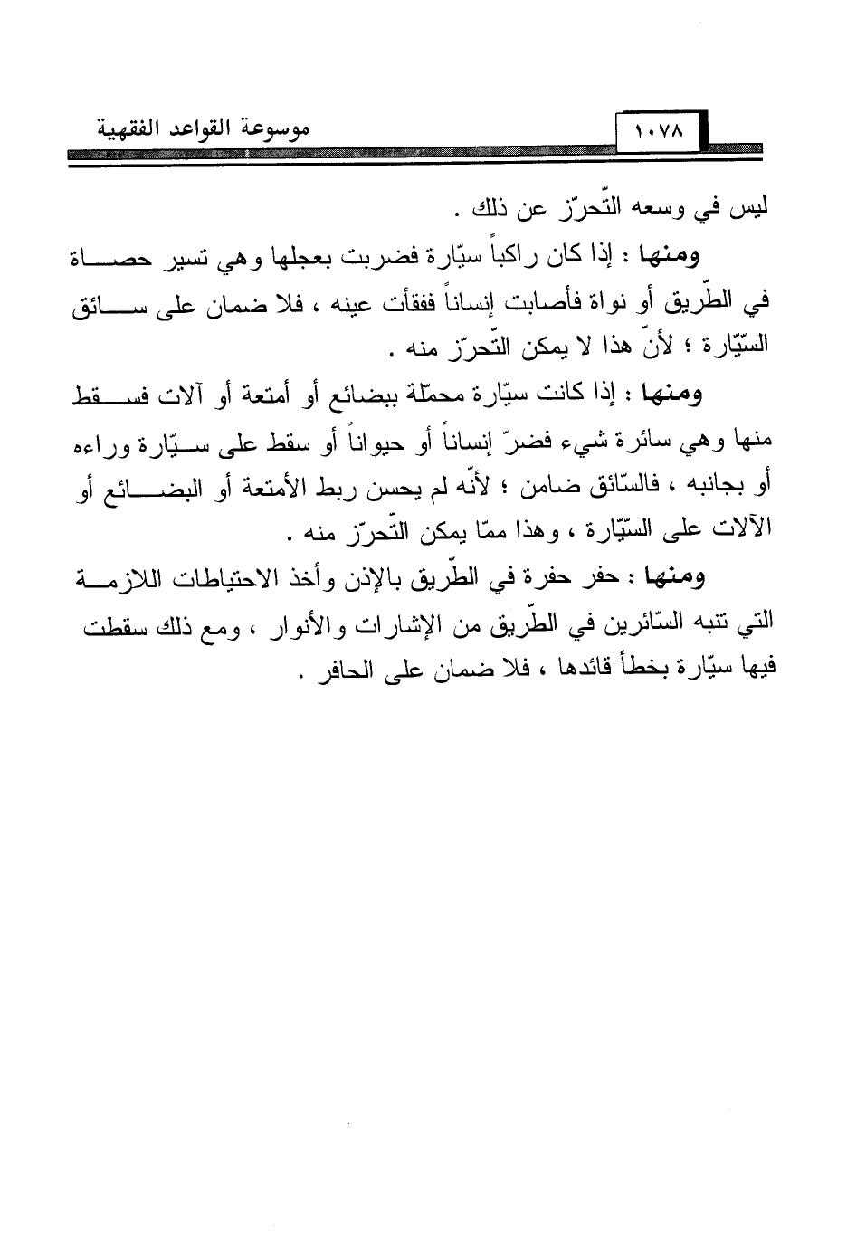 ومنها: إذا كانت سيّارة محمّلة ببضائع أو أمتعة أو آلات فسقط منها وهي سائرة شيء فضرّ إنساناً أو حيواناً أو سقط على سيّارة وراءه أو بجانبه، فالسّائق ضامن؛ لأنّه لم يحسن ربط الأمتعة أو البضائع أو الآلات على السّيّارة، وهذا ممّا يمكن التّحرّز منه.