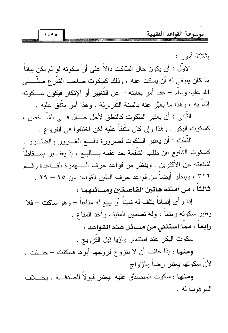 الثّالث: أن يعتبر السّكوت لضرورة دفع الغرور والضّرر. كسكوت الشّفيع عن طلب الشّفعة بعد علمه بالبيع، إذ يعتبر إسقاطاً لشفعته عن الأكثرين. وينظر من قواعد حرف الهمزة القاعدة رقم 316، وينظر أيضاً من قواعد حرف السّين القواعد من 25 - 29.