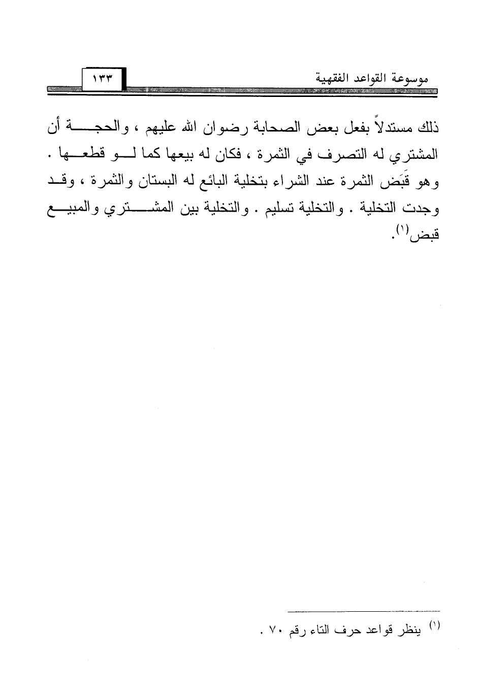 ذلك مستدلاً بفعل بعض الصحابة رضوان الله عليهم، والحجة أن المشتري له التصرف في الثمرة، فكان له بيعها كما لو قطعها. وهو قَبَض الثمرة عند الشراء بتخلية البائع له البستان والثمرة، وقد وجدت التخلية. والتخلية تسليم. والتخلية بين المشتري والمبيع قبض (¬1).