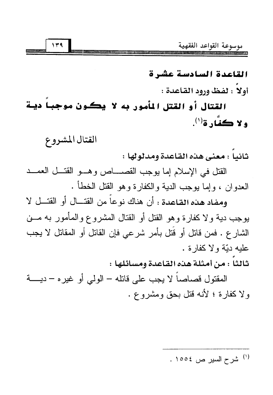 ومفاد هذه القاعدة: أن هناك نوعاً من القتال أو القتل لا يوجب دية ولا كفارة وهو القتل أو القتال المشروع والمأمور به من الشارع. فمن قاتل أو قَتل بأمر شرعي فإن القاتل أو المقاتل لا يجب عليه ديّة ولا كفارة.