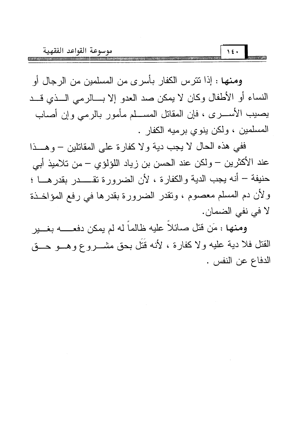 ففي هذه الحال لا يجب دية ولا كفارة على المقاتلين - وهذا عند الأكثرين - ولكن عند الحسن بن زياد اللؤلؤي - من تلاميذ أبي حنيفة - أنه يجب الدية والكفارة, لأن الضرورة تقدر بقدرها؛ ولأن دم المسلم معصوم، وتقدر الضرورة بقدرها في رفع المؤاخذة لا في نفي الضمان.
