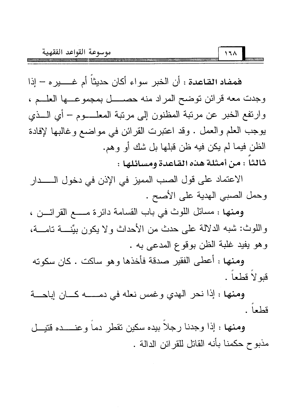 ومنها: مسائل اللوث في باب القسامة دائرة مع القرائن، واللوث: شبه الدلالة على حدث من الأحداث ولا يكون بيِّنة تامة، وهو يفيد غلبة الظن بوقوع المدعى به.