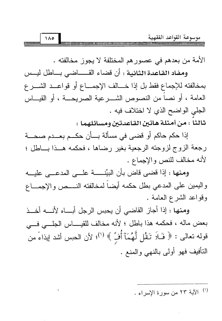 ومفاد القاعدة الثانية: أن قضاء القاضي باطل ليس بمخالفته للإجماع فقط بل إذا خالف الإجماع أو قواعد الشرع العامة، أو نصاً من النصوص الشرعية الصريحة، أو القياس الجلي الواضح الذي لا اختلاف فيه.