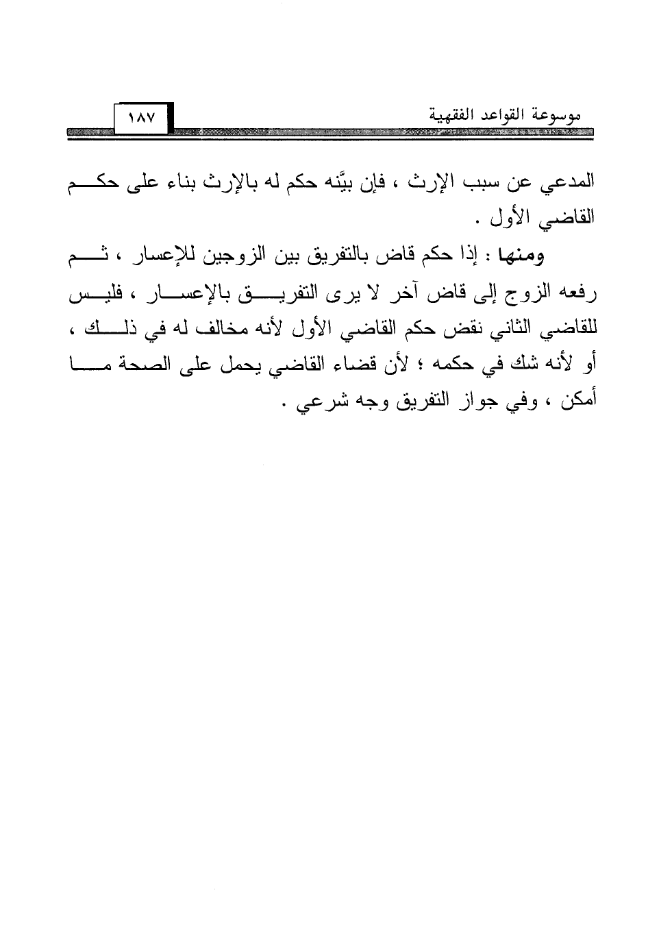 ومنها: إذا حكم قاض بالتفريق بين الزوجين للإعسار، ثم رفعه الزوج إلى قاض آخر لا يرى التفريق بالإعسار، فليس للقاضي الثاني نقض حكم القاضي الأول لأنه مخالف له في ذلك، أو لأنه شك في حكمه؛ لأن قضاء القاضي يحمل على الصحة ما أمكن، وفي جواز التفريق وجه شرعي.