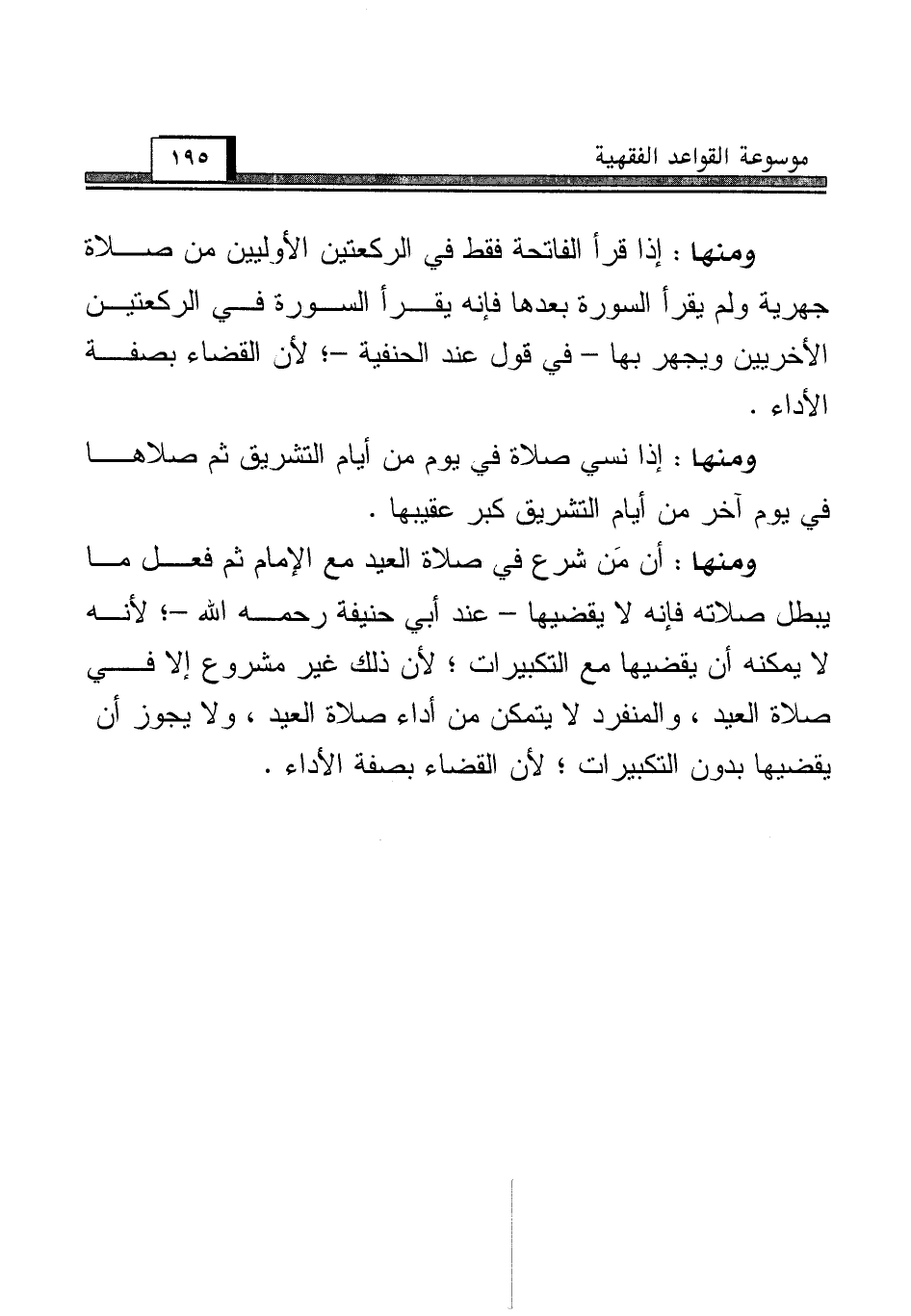 ومنها: أن مَن شرع في صلاة العيد مع الإِمام ثم فعل ما يبطل صلاته فإنه لا يقضيها - عند أبي حنيفة رحمه الله -؛ لأنه لا يمكنه أن يقضيها مع التكبيرات؛ لأن ذلك غير مشروع إلا في صلاة العيد، والمنفرد لا يتمكن من أداء صلاة العيد، ولا يجوز أن يقضيها بدون التكبيرات؛ لأن القضاء بصفة الأداء.