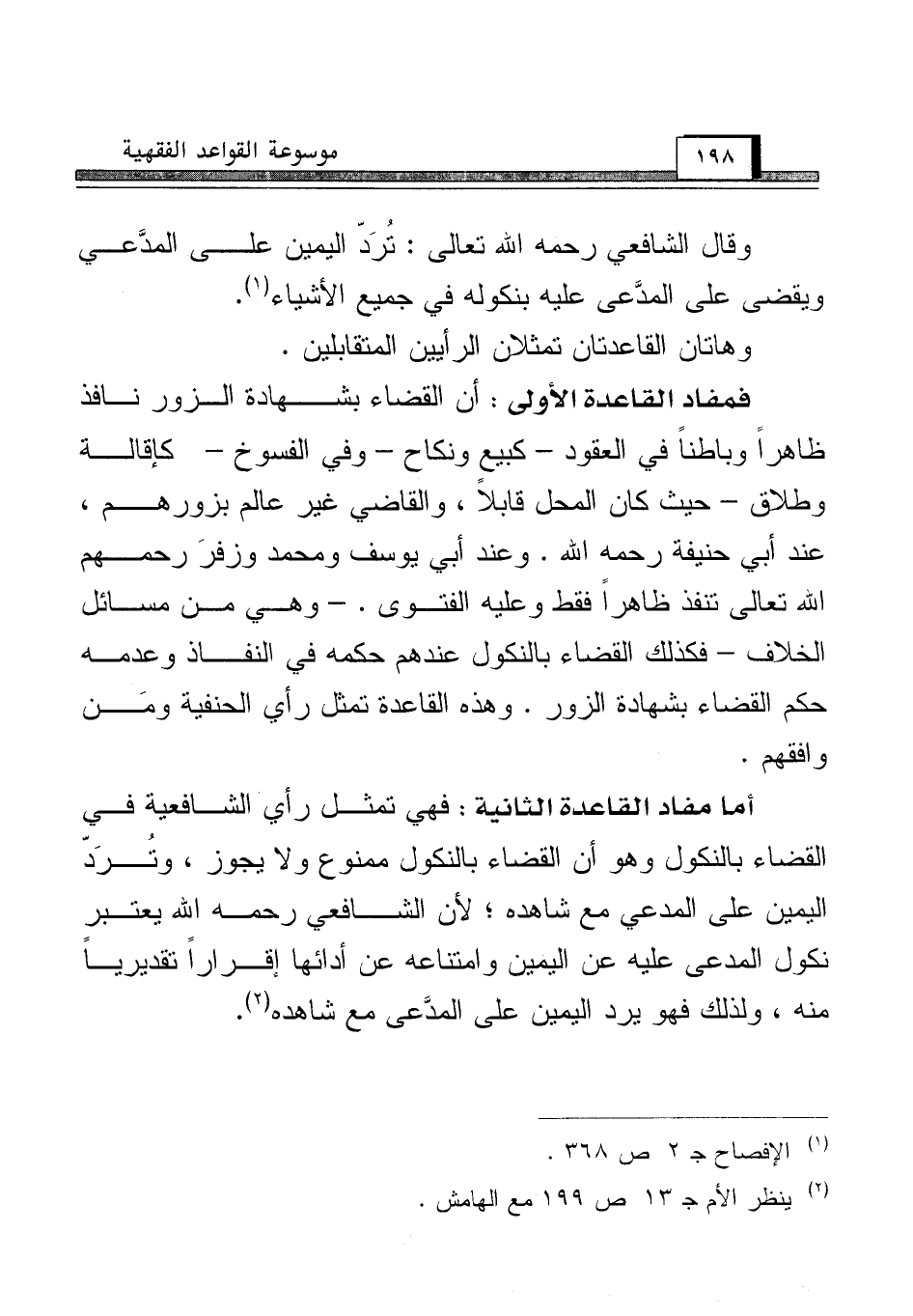 أما مفاد القاعدة الثانية: فهي تمثل رأي الشافعية في القضاء بالنكول وهو أن القضاء بالنكول ممنوع ولا يجوز، وتُرَدّ اليمين على المدعي مع شاهده؛ لأن الشافعي رحمه الله يعتبر نكول المدعى عليه عن اليمين وامتناعه عن أدائها إقراراً تقديرياً منه، ولذلك فهو يرد اليمين على المدَّعي مع شاهده (¬2).