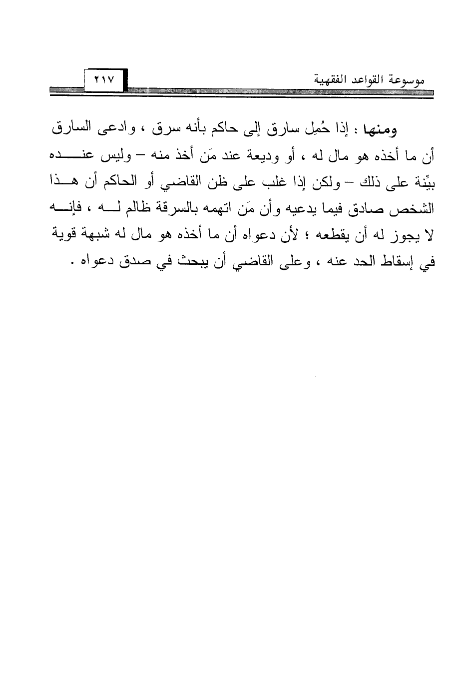 ومنها: إذا حُمِل سارق إلى حاكم بأنه سرق، وادعى السارق أن ما أخذه هو مال له، أو وديعة عند مَن أخذ منه - وليس عنده بيِّنة على ذلك - ولكن إذا غلب على ظن القاضي أو الحاكم أن هذا الشخص صادق فيما يدعيه وأن مَن اتهمه بالسرقة ظالم له، فإنه لا يجوز له أن يقطعه؛ لأن دعواه أن ما أخذه هو مال له شبهة قوية في إسقاط الحد عنه، وعلى القاضي أن يبحث في صدق دعواه.