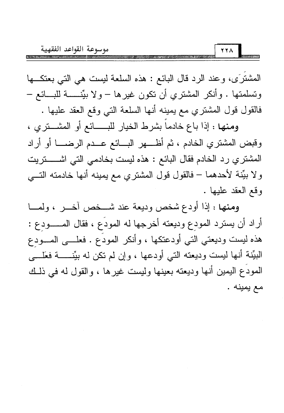 ومنها: إذا أودع شخص وديعة عند شخص آخر، ولما أراد أن يسترد المودِع وديعته أخرجها له المودَع، فقال المودِع: هذه ليست وديعتي التي أودعتكها، وأنكر المودَع. فعلى المودِع البيِّنة أنها ليست وديعته التي أودعها، وإن لم تكن له بيِّنة فعَلى المودَع اليمين أنها وديعته بعينها وليست غيرها، والقول له في ذلك مع يمينه.
