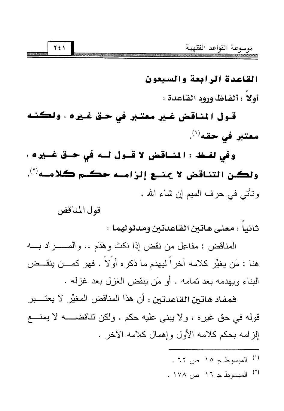 وفي لفظ: المناقض لا قول له في حق غيره، ولكن التناقض لا يمنع إلزامه حكم كلامه (¬2). وتأتي في حرف الميم إن شاء الله.