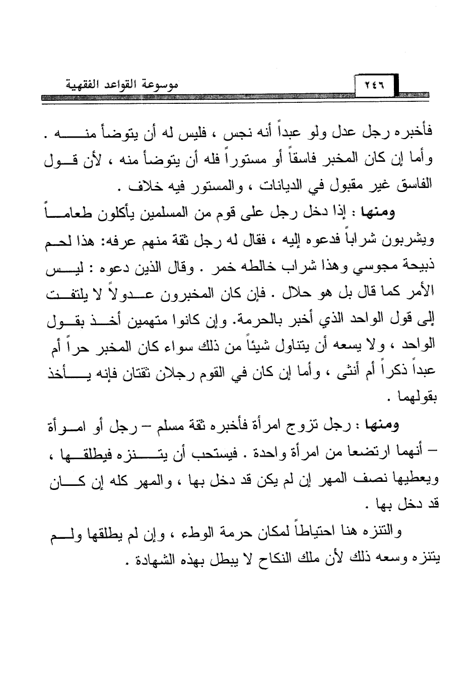 ومنها: إذا دخل رجل على قوم من المسلمين يأكلون طعاماً ويشربون شراباً فدعوه إليه، فقال له رجل ثقة منهم عرف: هذا لحم ذبيحة مجوسي وهذا شراب خالطه خمر. وقال الذين دعوه: ليس الأمر كما قال بل هو حلال. فإن كان المخبرون عدولاً لا يلتفت إلى قول الواحد الذي أخبر بالحرمة. وإن كانوا متهمين أخذ بقول الواحد، ولا يسعه أن يتناول شيئاً من ذلك سواء كان المخبر حراً أم عبداً ذكراً أم أنثى، وأما إن كان في القوم رجلان ثقتان فإنه يأخذ بقولهما.