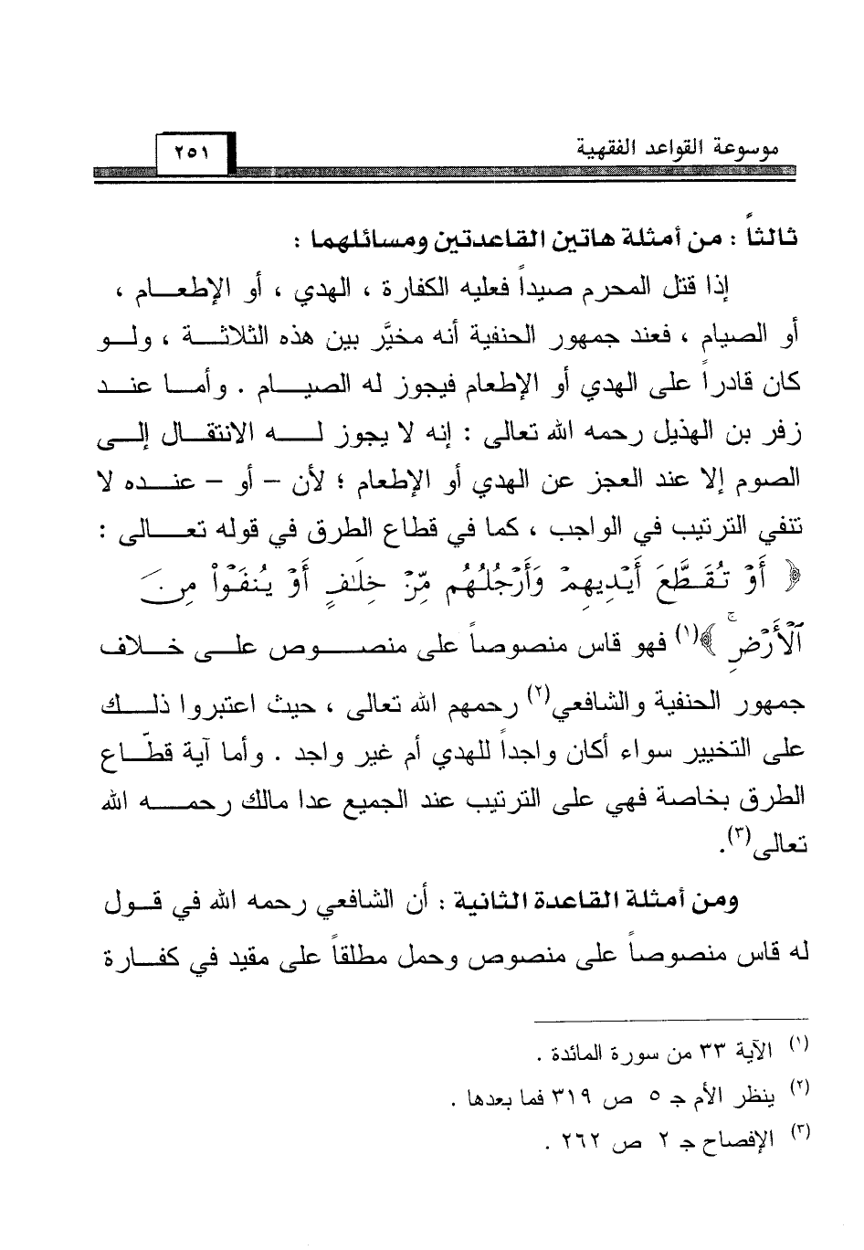 إذا قتل المحرم صيداً فعليه الكفارة، الهدي، أو الإطعام، أو الصيام، فعند جمهور الحنفية أنه مخيَّر بين هذه الثلاثة، ولو كان قادراً على الهدي أو الإطعام فيجوز له الصيام. وأما عند زفر بن الهذيل رحمه الله تعالى: إنه لا يجوز له الانتقال إلى الصوم إلا عند العجز عن الهدي أو الإطعام؛ لأن - أو - عنده لا تنفي الترتيب في الواجب، كما في قطاع الطرق في قوله تعالى: {أَوْ تُقَطَّعَ أَيْدِيهِمْ وَأَرْجُلُهُمْ مِنْ خِلَافٍ أَوْ يُنْفَوْا مِنَ الْأَرْضِ} (¬1) فهو قاس منصوصاً على منصوص على خلاف جمهور الحنفية والشافعي (¬2) رحمهم الله تعالى، حيث اعتبروا ذلك على التخيير سواء أكان واجداً للهدي أم غير واجد. وأما آية قطَاع الطرق بخاصة فهي على الترتيب عند الجميع عدا مالك رحمه الله تعالى (¬3).