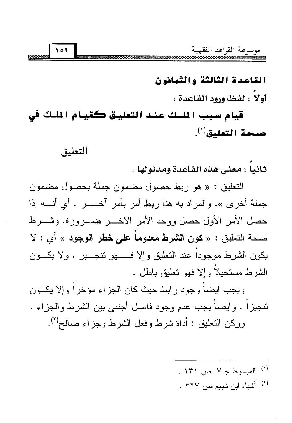 التعليق: "هو ربط حصول مضمون جملة بحصول مضمون جملة أخرى". والمراد به هنا ربط أمر بأمر آخر. أي أنه إذا حصل الأمر الأول حصل ووجد الأمر الآخر ضرورة. وشرط صحة التعليق: "كون الشرط معدوماً على خطر الوجود" أي: لا يكون الشرط موجوداً عند التعليق وإلا فهو تنجيز، ولا يكون الشرط مستحيلاً وإلا فهو تعليق باطل.